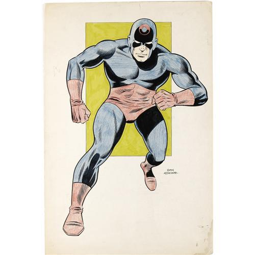 <B>Dan Adkins - Vintage Menthor Pin-Up Specialty Illustration Original Art (circa 1968).</B></I> In the sixties, Dan Adkins was one of Tower and Marvel Comics' top inkers. A oft-time assistant to Wally Wood, Adkins' own polished ink work was an ideal fit for the Silver Age hero, and he created a sensational pin-up of Menthor, the psychic T.H.U.N.D.E.R. Agent. The overall size of this ink and colored pencil pin-up measures 14" x 21". Aside from a water stain in the lower right corner, some edge wear, and light overall paper aging, the art is in Very Good condition. <BR><BR><B>Important notice:</B> Heritage usually auctions material at the rate of 200-250 lots per hour. On some occasions eBay Live bid software or the Internet may not be able to keep up with the pace of the auction. We recommend placing a realistic absentee bid now as insurance to avoid disappointment. Occasionally the auctioneer may eliminate or reject an eBay Live bid, and the auctioneer may also reopen a lot after the close of the eBay live bidding (usually because we missed an audience bid), and may reject your bid even if it shows you as the winning bidder. By bidding via eBay Live, you agree that Heritage may award the lot to another bidder at its sole discretion under the circumstances described above or any other reasonable circumstances. Since eBay bids are not shown to us until we open the lot on the floor, we treat those bids just like floor bids. In most cases the floor responds before the eBay bid is presented to us, due to Internet lag time, so for consistency we have made it a policy that floor bids are always considered first over tie eBay live bids. Also please note that all Heritage lots purchased through eBay Live carry a 22.5% Buyer's Premium. Please make sure you read the Terms and Conditions before you bid. This lot is being auctioned in conjunction with a live floor auction by Heritage Auction Galleries. All final auction and invoice information will be supplied by Heritage Auction Galleries, and all other information should be considered preliminary. Lot:41001 <BR><BR><B>Winning Notification and Billing:</B> After the FINAL session in this auction is complete, Heritage will send e-mail and snail mail invoices. This process normally takes several days. All final auction and invoice information will be supplied by Heritage Auction Galleries, and all other information should be considered preliminary. <BR><BR>This auction will be conducted on a live auction floor and over the Internet through eBay Live. If you choose to place an absentee bid, please take a moment to <font color='#0000ff'><u><a href='http://pages.ebay.com/liveauctions/help/before/laabsentee.html'>learn how eBay Live absentee bidding works</a></u></font><font color='#000000'>