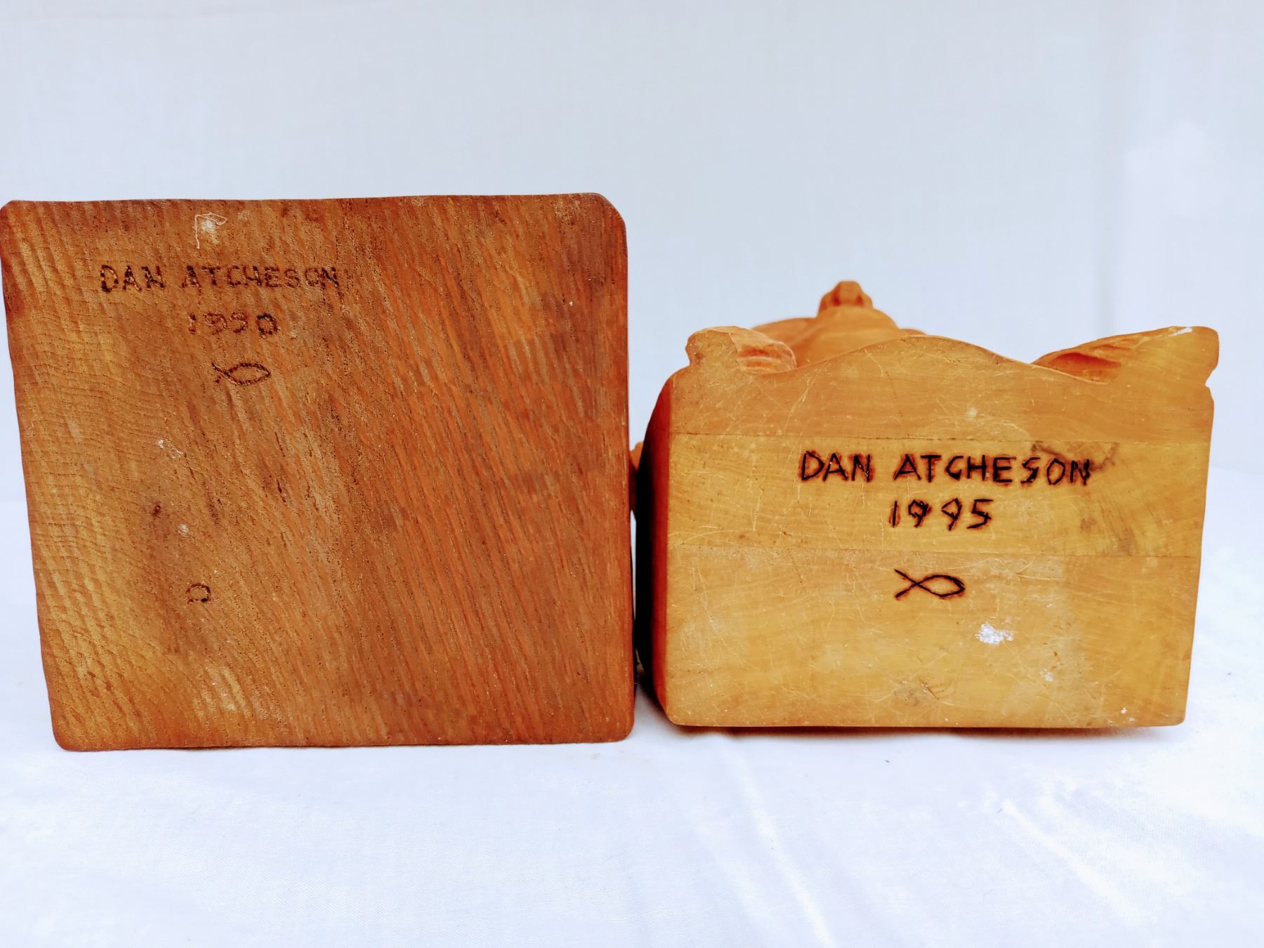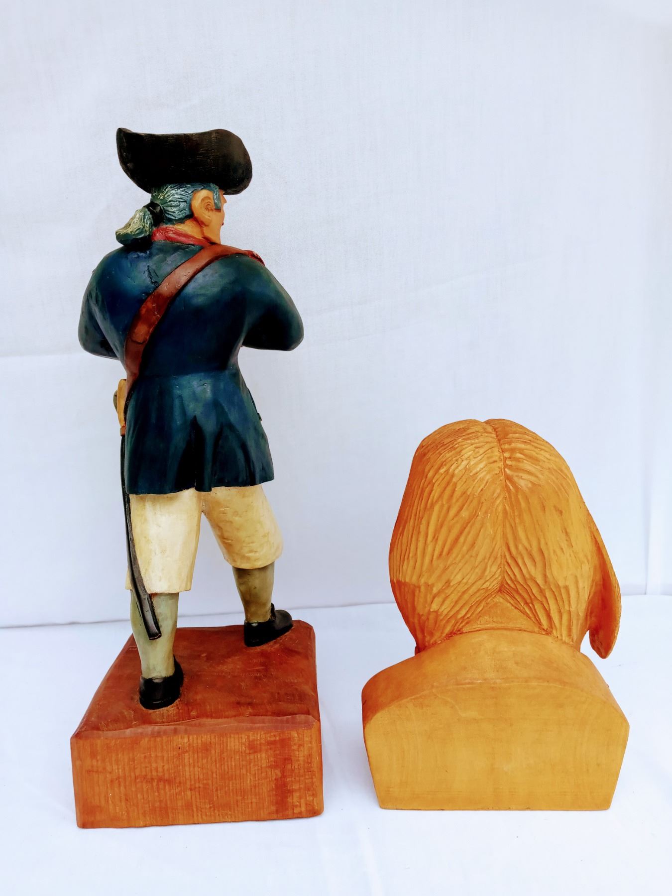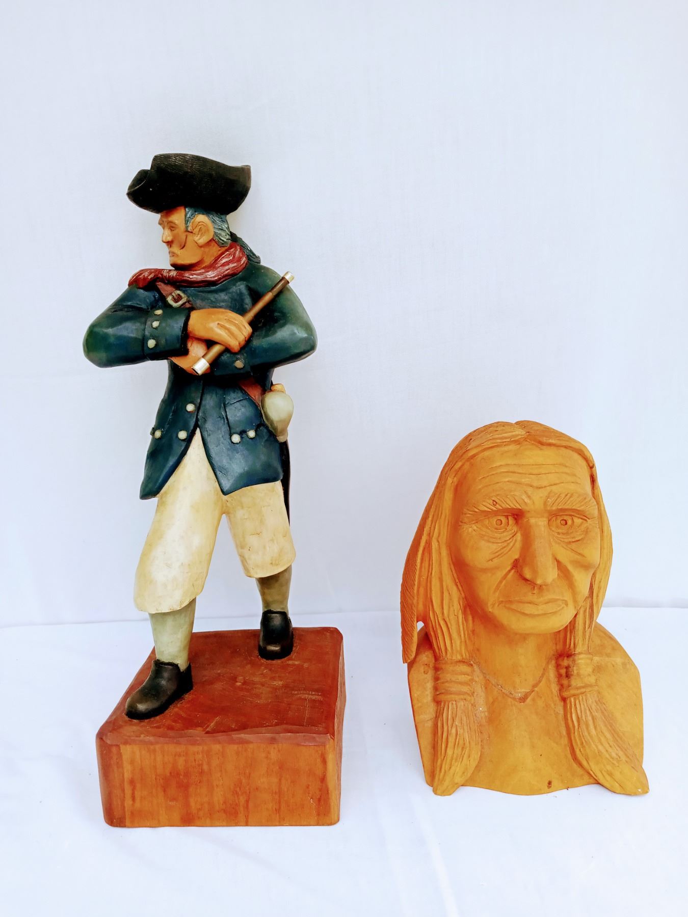 2 Dan Atcheson Carved Wood Sculptures from 1990s (one Indian Head 8" H and Revolutionary War Minute Man 14 3/4" H).