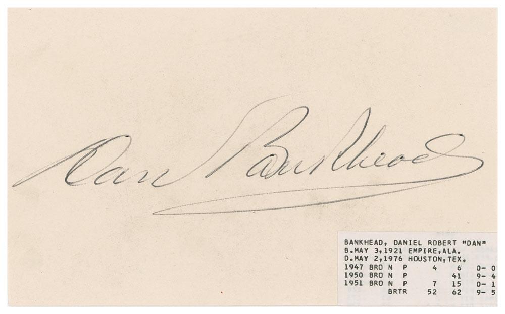 First African-American pitcher in Major League Baseball (1920–1976). Ballpoint signature, “Dan Bankhead,” on an off-white 4.25 x 2.5 card, with a small statistical caption affixed to lower right corner. In fine condition, with some scattered light soiling.