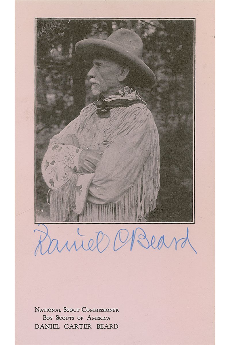 Vintage 3.5 x 6 cardstock photo of Beard in his scouting garb, signed in blue ballpoint, “Daniel C. Beard.” In fine condition.
