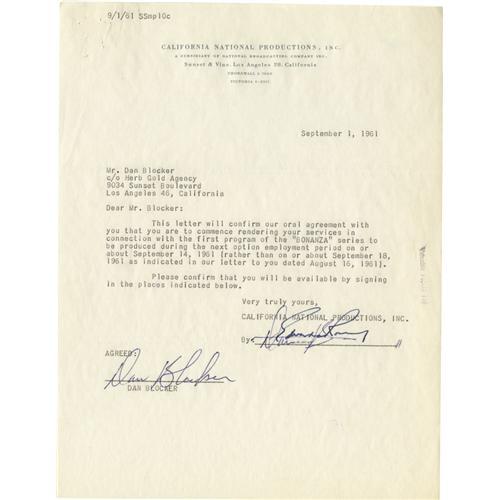 <B>Dan Blocker Signed Original "Bonanza" Agreement.</B></I> A one-page, typed letter on California National Productions letterhead dated September 1, 1961, confirming Dan Blocker's oral agreement to star as "Hoss Cartwright" on the television series <I>Bonanza.</B></I> The agreement is signed by Blocker in blue ink, and i in Very Fine condition with light wear and tanning, two mailing creases, and some staple holes to the upper left corner.<I>Accompanied by LOA from PSA/DNA.</B></I><BR><BR><b>Shipping:</b> Small Flat (<a target="_blank" href="http://www.heritageauctions.com/common/shipping.php">view shipping information</a>)