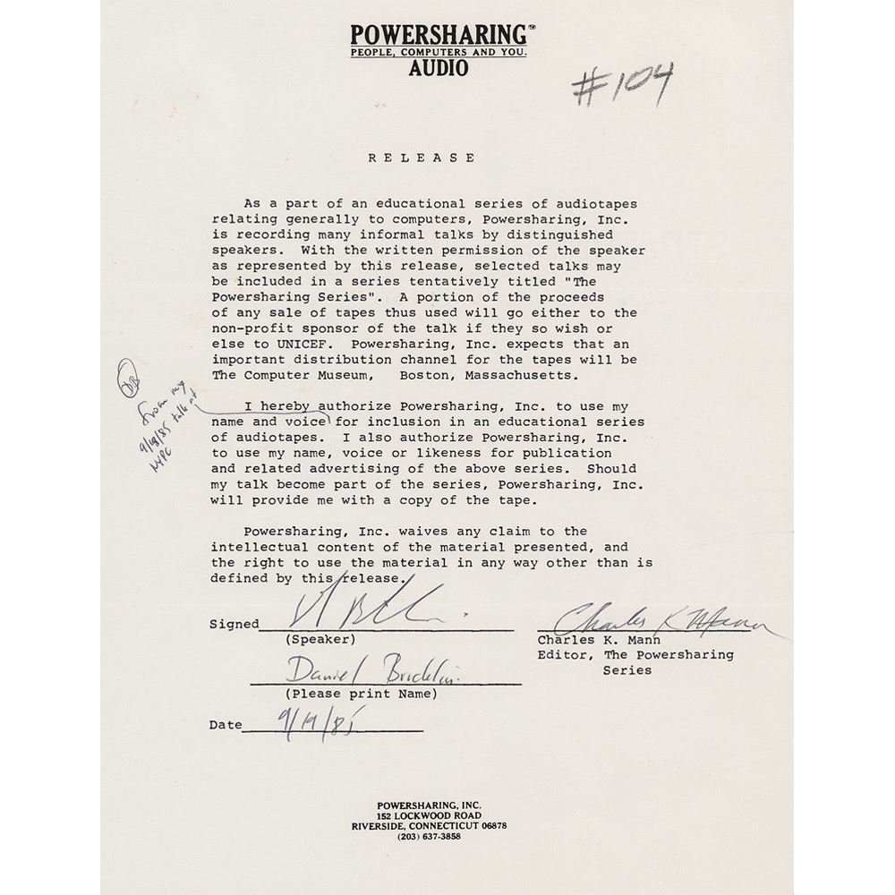DS, one page, 8.5 x 11, September 19, 1985. Bricklin consents to the release of his lecture, 'The Story of VisiCalc,' given at NYPC (NY IBM Personal Computer Users Group) on September 18, 1985, as part of Charles Mann's "series tentatively titled 'The Powersharing Series.'" Signed at the conclusion in ballpoint by Bricklin, printing his name and writing the date below. He also makes an amendment to the text, "from my 9/18/85 talk at NYPC," and signs with his initials, "DB." Countersigned in ink by Mann. In fine condition.