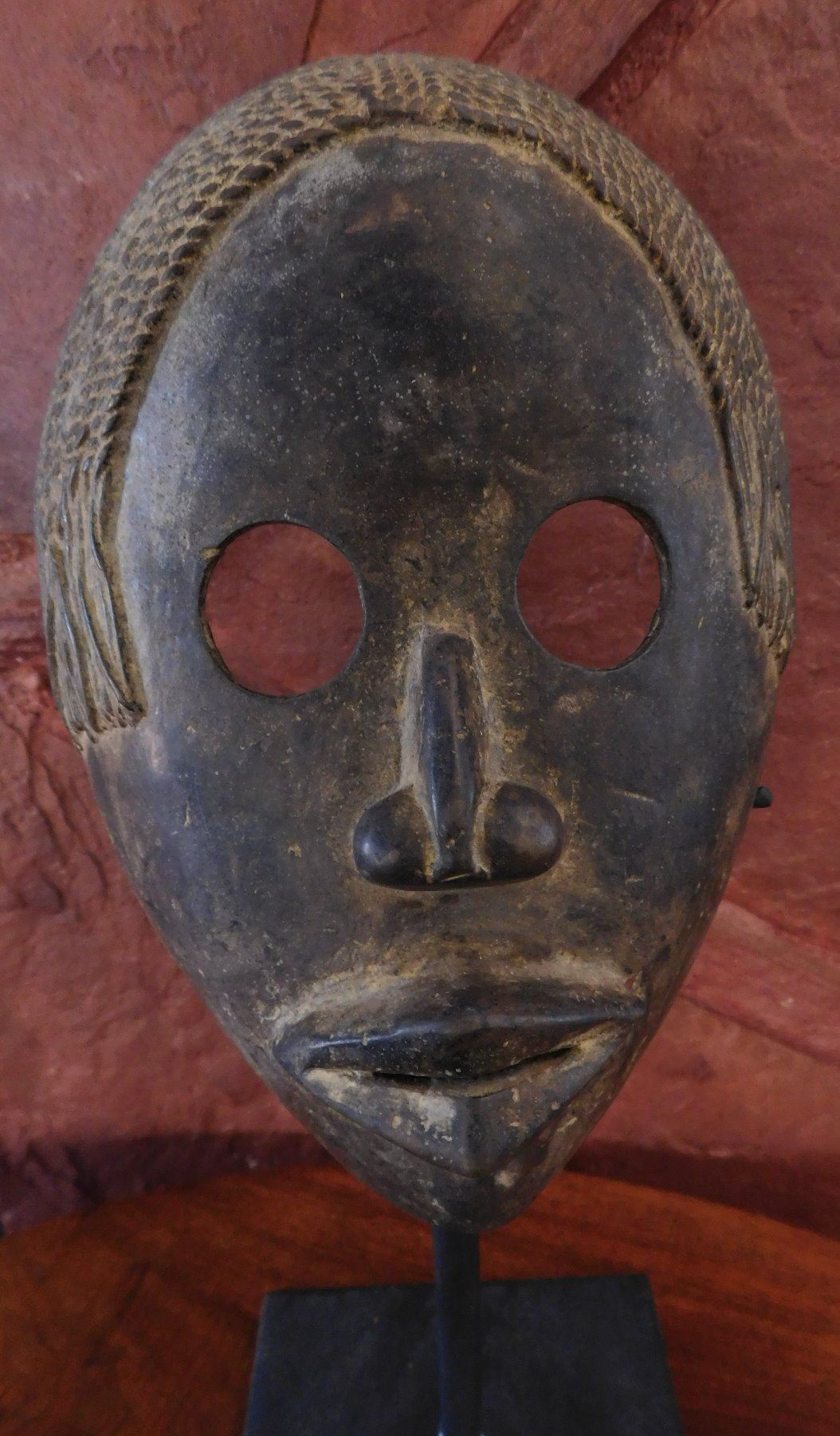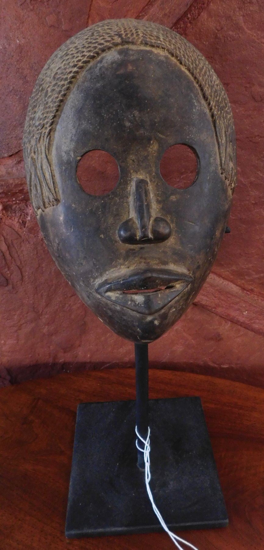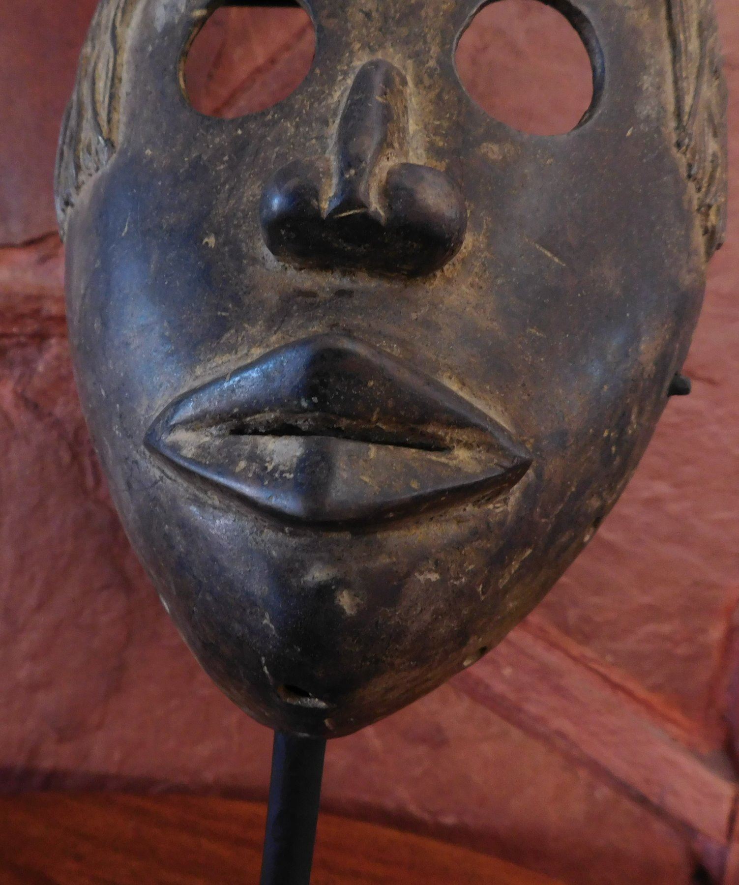 Dan Bronze Mask w/Stand, 18th century item. Made of bronze, the item measures 8 1/2" x 5 1/2" x 2 1/2". Ivory Coast. Very fine and important African mask. Condition: Some minor damage, see images. Shipping: $30.00 w/insurance and signature.