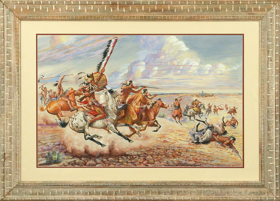 Dan Cody Muller (1889-1977). War Party. 21" x 32" gouache. Signed lower left: DAN MULLER. (est. $2,000-3,000). Provenance: The S. George & Helen Binson Estate, donated to the Cheyenne Frontier Days Old West Museum (Cheyenne, WY).. CONDITION REPORTS: www.auctioninsantafe.com/docs/cr2012.pdf