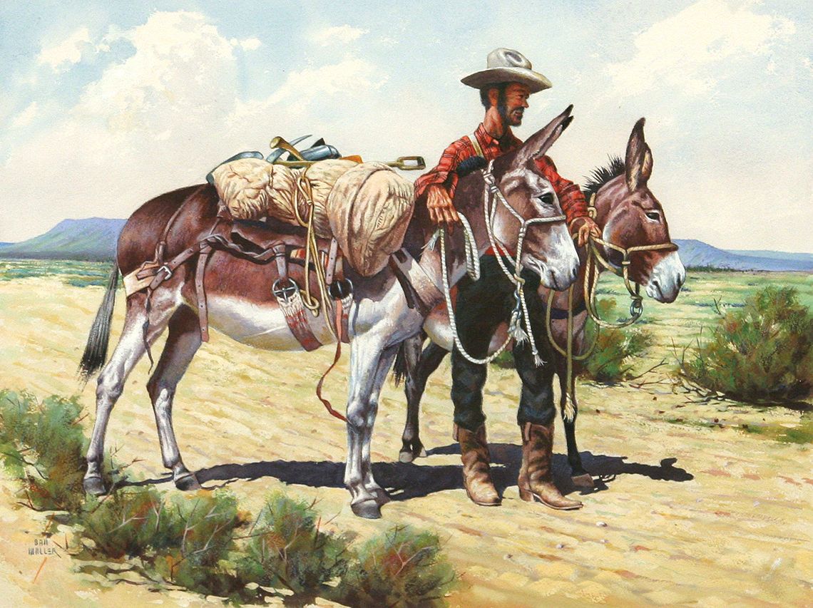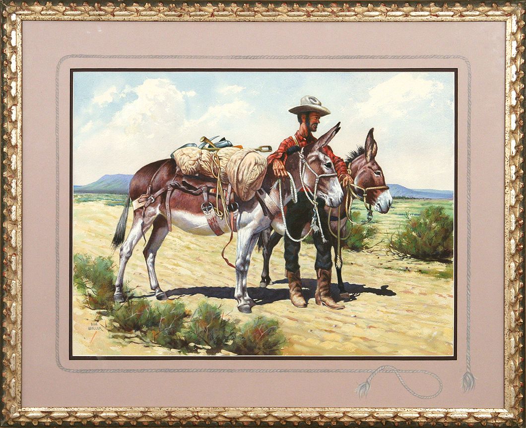 Dan Cody Muller (1889-1977). Prospector. 18" x 24" gouache. Signed lower left: DAN MULLER. (est. $2,000-3,000). Literature: Front cover of Old West magazine, Winter, 1981 edition. Framed copy included. Provenance: The S. George & Helen Binson Estate, donated to the Cheyenne Frontier Days Old West Museum (Cheyenne, WY).. CONDITION REPORTS: www.auctioninsantafe.com/docs/cr2012.pdf