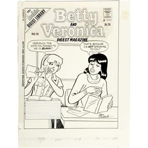 <B>Dan DeCarlo - Betty and Veronica Digest Magazine #78 Cover Original Art (Archie, 1995).</B></I> America's favorite gal-pals have done it again. This cover has an image area of 10" x 14". The top border of the paper was trimmed right to the edge of the image area; otherwise, the piece is in Excellent condition.<BR><BR><b>Shipping:</b> Flat Material, Small (<a target="_blank" href="http://www.heritageauctions.com/common/shipping.php">view shipping information</a>)