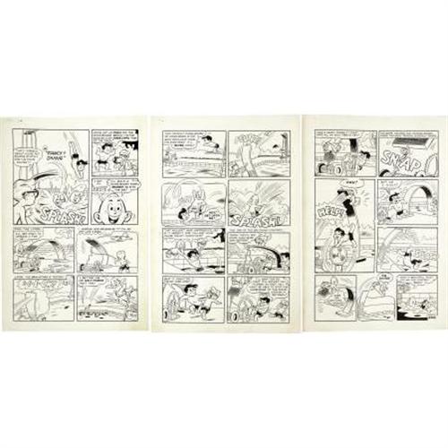 <B>Dan DeCarlo - The Brain, Complete 3-page Story "Fancy Diving?" Original Art (ME, circa 1957).</B></I> That little egghead, the Brain, invents a Rube Goldberg-like diving machine and Dink and Russel are the ones who suffer the consequences in this hilarious 3-pager drawn by the great Dan DeCarlo. Each page of this romp has an image area of 12" x 18", and the averages Excellent condition.<BR><BR><b>Shipping:</b> Flat Material, Small (<a target="_blank" href="http://www.heritageauctions.com/common/shipping.php">view shipping information</a>)