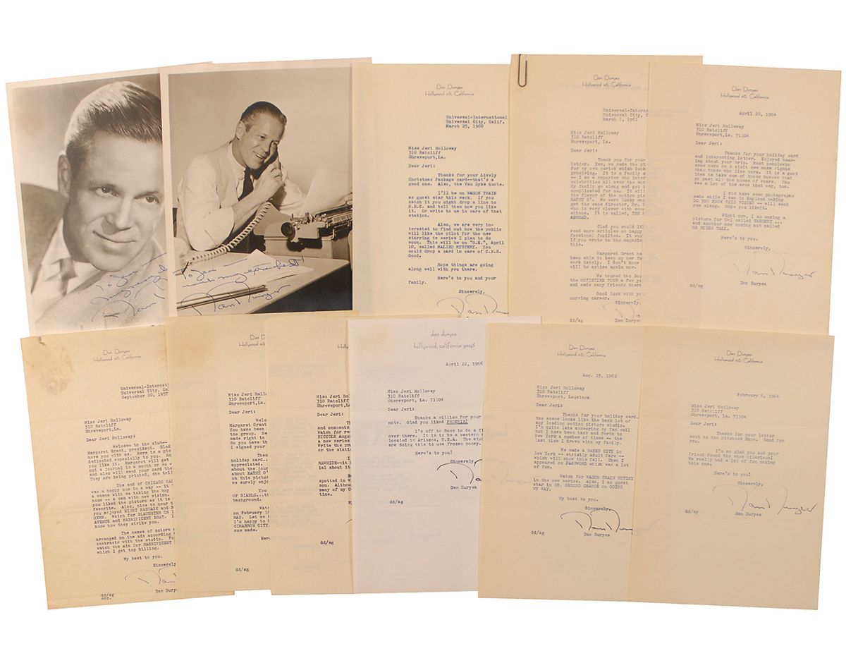 Collection of nine TLSs, two signed photos, three unsigned promotional photos, a signed sympathy card, and four promotional postcards. Letters date from the 1950s and 60s, all to the same recipient, mentioning upcoming film and television projects including Wagon Train, Naked City, Taggert, He Rides Tall and one mentioning Alfred Hitchcock. Both photos are vintage matte-finish 8 x 10 images of Duryea, both signed and inscribed to Jeri; and the three unsigned promotional photos are from Night Passage. In very good overall condition.