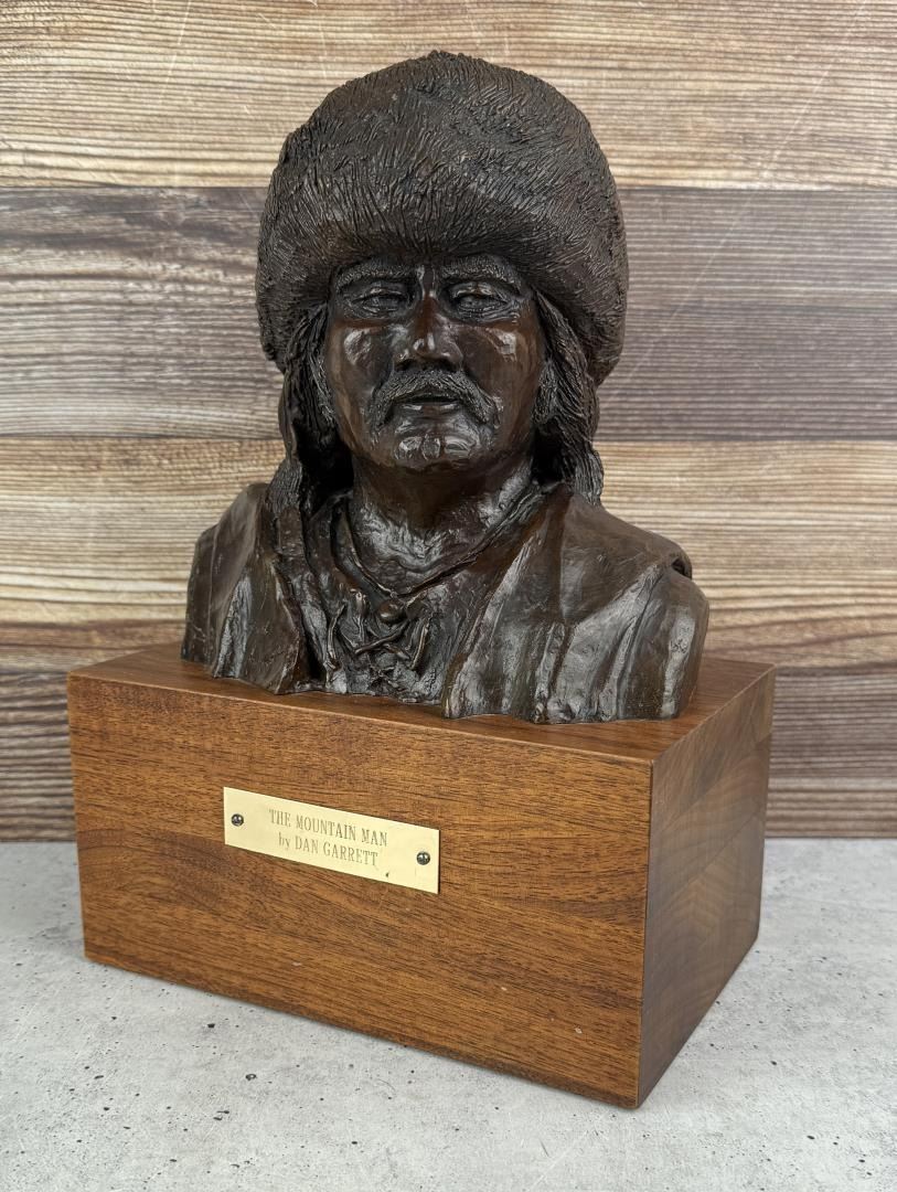 Title is The Mountain Man. 11 1/4" by 8" by 5 1/2". Dan Garrett (Born 1948) is active/lives in Wyoming. Dan Garrett is known for Indian figure sculpture. For as long as he could remember, Dan Garret aspired to a career in art. A singular event put him completely on-course with this objective - when his parents took over a greeting card company during Garret's mid-teens. Traveling with his father around the countryside visiting artists in their studios and looking at their works, Garret got to know legends of the art world such as George Phippen and John Clymer, and especially Bob Lougheed, who contributed significantly to Garret's awareness that one could make a living doing what one loved. Because Garret's parents had such a strong interest in art, he enjoyed the stimulation of being exposed to it all his life. The academic experience of college wasn't all too satisfying for Garret, however, because his was interested in realism and the West, while the department was modern in its approach. But Garret felt he could learn the most by doing, and that's just what he did. With the support of his wife, Edith, who gave encouragement throughout the "lean" years, and with the mentoring of Cheyenne artist Lyle Tayson, Garret gained in proficiency as a painter. Somehow, though, painting just didn't suit Garret's personality. In 1985 he took the plunge and began sculpting. Again, perfect timing was with Garret when he took a sculpting class from Edward Fraughton. It was then that any idea of quitting the art business left him forever. Now, Garret is able to infuse his sculpture with the archaeology and prehistory he loves as he and Edith spend typical summers traveling and conducting the considerable scholarship his historically accurate subjects require. Hard work and determination - as well as luck - have enabled Garret to realize his dreams.