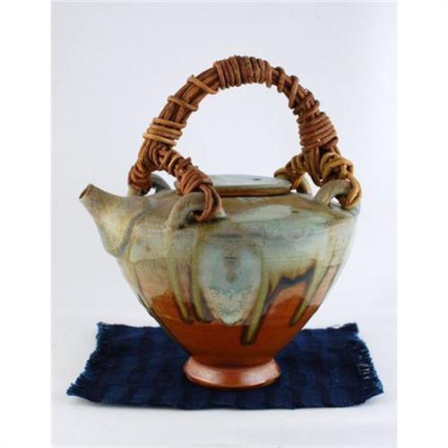 Dan Greenfeld is a New York City potter-ceramic artist (a hyphenate he obsesses over) specializing in teapots ? porcelain, wood-fired, wisteria handled ? that are as functional as they are beautiful. After traveling and studying extensively throughout Japan, Dan chose to explore the teapot because he was challenged by the form's inherently conflicting aesthetic and functional issues. As his thinking evolved, he began to understand that a teapot of sufficient beauty and functionality could enhance people's lives. The teapot can be the focal point of a daily ritual (used in the best sense of the word) encompassing aesthetic contemplation, tea connoisseurship, considered and focused utilization of the senses, and most importantly, discourse and human connection ? the essence of the tea ceremony. Height 6 inches, 15.5 cm. Width: 5.5 inches, 14 cm. The handle adds an additional 3 inches (7.5 cm) to the height.