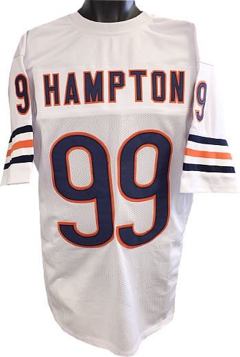 Dan Hampton was drafted by the Bears in the first round of the 1979 draft. In 1979 he was voted All-Rookie by the Pro Football Writers Association. The following year he was a Second-team All-Pro selection and was voted to his first Pro Bowl after recording 11½ sacks which lead the Bears. He was selected to four Pro Bowls and was a key defensive member of the Bears' Super Bowl XX win against the New England Patriots in 1985. Hampton was selected to the Pro Football Hall of Fame in 2002. This is a Dan Hampton Chicago Bears unsigned White TB unlicensed custom-prostyle jersey with twill stitched nameplate and numbers. perfect for autograph or to wear! This is not an NFL Licensed jersey. It has no logos, tags or emblems. Size XL