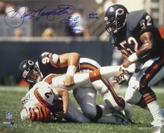 Dan Hampton was drafted by the Bears in the first round of the 1979 draft. In 1979 he was voted All-Rookie by the Pro Football Writers Association. The following year he was a Second-team All-Pro selection and was voted to his first Pro Bowl after recording 11½ sacks which lead the Bears. He was selected to four Pro Bowls and was a key defensive member of the Bears' Super Bowl XX win against the New England Patriots in 1985. Hampton was selected to the Pro Football Hall of Fame in 2002. He has hand signed this Chicago Bears 16x20 Photo with dual HOF 2002 & SB XX Champs inscriptions. Certificate of Authenticity from Athlon Sports.