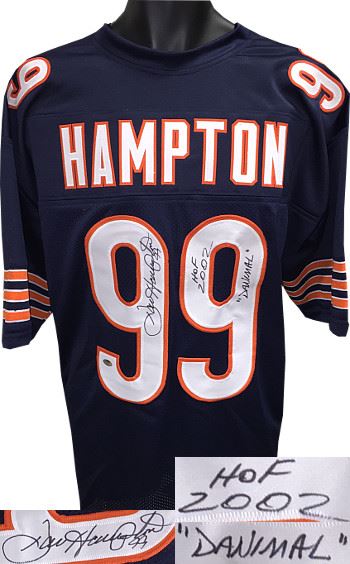 Dan Hampton was drafted by the Bears in the first round of the 1979 draft. In 1979 he was voted All-Rookie by the Pro Football Writers Association. The following year he was a Second-team All-Pro selection and was voted to his first Pro Bowl after recording 11½ sacks which lead the Bears. He was selected to four Pro Bowls and was a key defensive member of the Bears' Super Bowl XX win against the New England Patriots in 1985. Hampton was selected to the Pro Football Hall of Fame in 2002. This is a Dan Hampton Chicago Bears signed TB Navy unlicensed custom-prostyle jersey with twill stitched nameplate and numbers with dual #99 HOF 2002 & "DANIMAL" inscriptions. Size XL. Schwartz Sports Hologram and Certificate of Authenticity from Athlon Sports Collectibles.