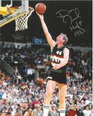 Dan Issel remained with the Nuggets following the ABA-NBA merger in June 1976, and he represented Denver in the 1977 NBA All-Star Game. He continued playing through the 1984-1985 season, and received the NBA's J. Walter Kennedy Citizenship Award in 1985 for his outstanding service to the community. Issel accumulated over 27,000 points in his combined ABA and NBA career. At the time of his retirement the only professional basketball players to have scored more points than Issel were Kareem Abdul-Jabbar, Wilt Chamberlain and Julius Erving. He currently ranks #8 on the all time combined ABA/NBA scoring list. Dan Issel has hand signed this Denver Nuggets 8x10 Photo with HOF 1993 inscription. Certificate of Authenticity from Athlon Sports.