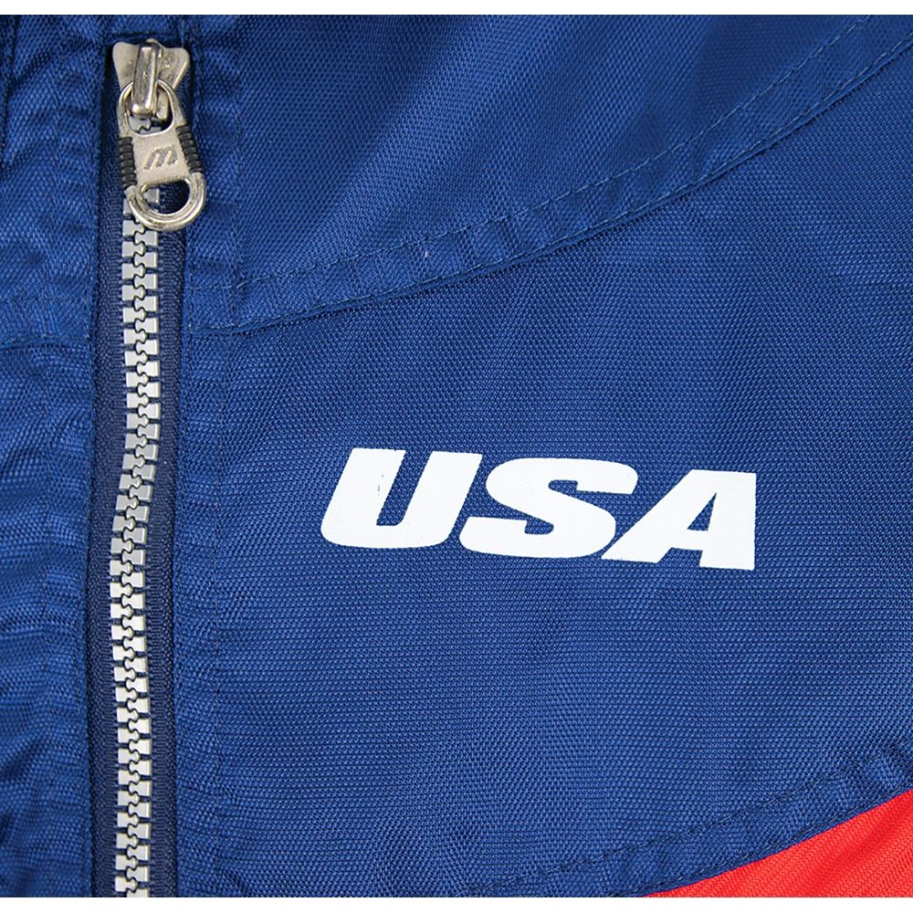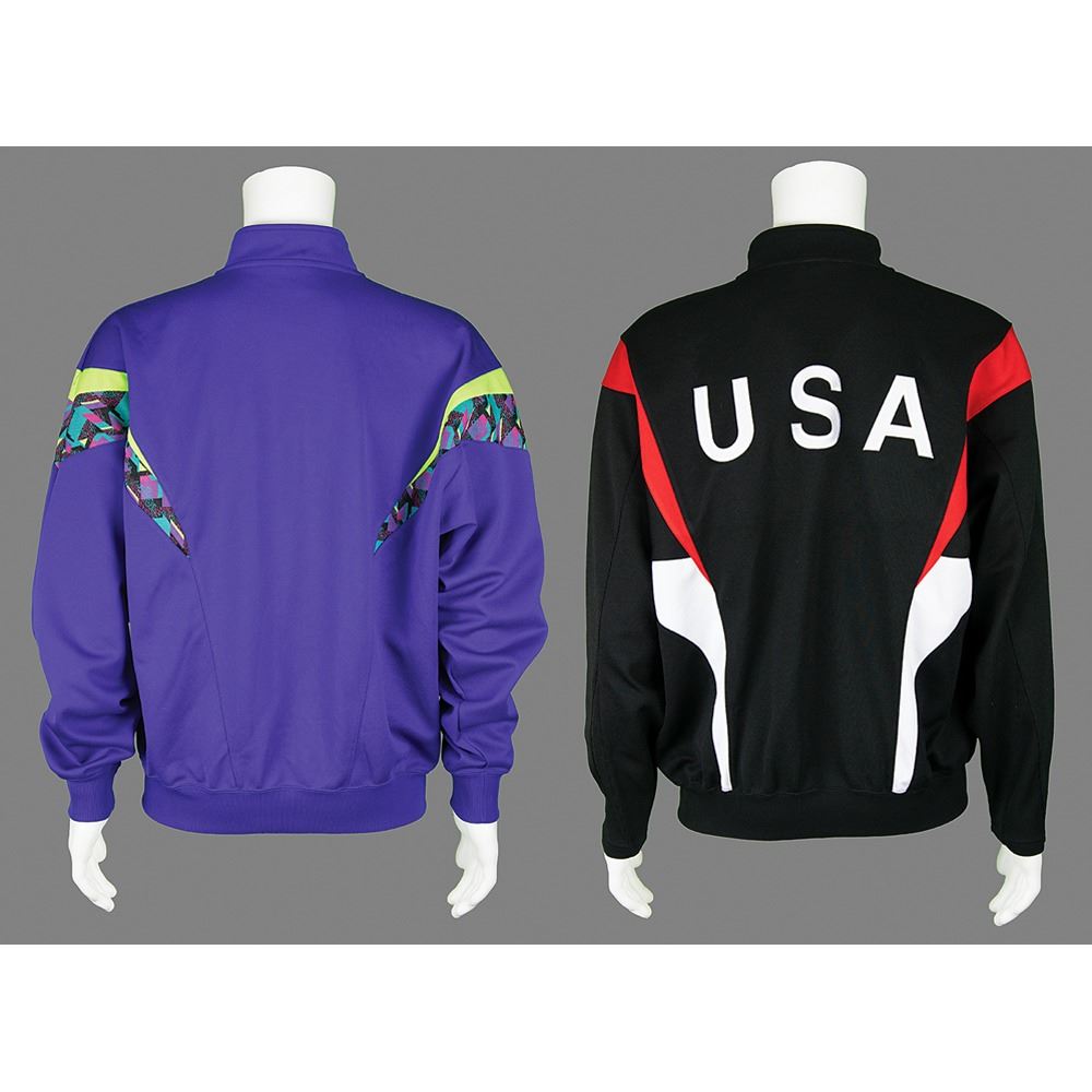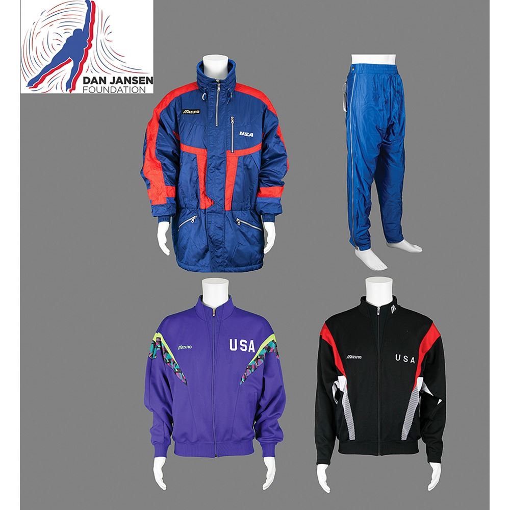 Dan Jansen's personally-owned and -worn lot of three Mizuno jackets and a pair of warm-up pants, all of which were issued to him as a member of the Team USA speed skating team. The lot includes two zippered warm-up jackets, one black and one blue, both tagged as “Exercise Unit, Super Star†and annotated "DJ," size large, with “USA†embroidered in white to either the chest or back; a red-and-blue zippered winter coat, size large, with “USA†printed on the left chest and the interior Mizuno label annotated “DJ†in the name field; and a pair of fleece-lined blue warm-up pants, size medium-large, featuring zippered outseams and the original still-attached Mizuno tag annotated as “No. 276-2†and “88-84.†In overall fine condition, with light staining to the blue jacket.
