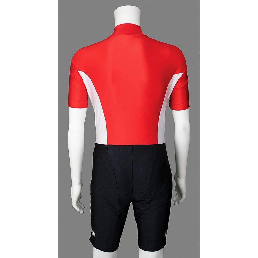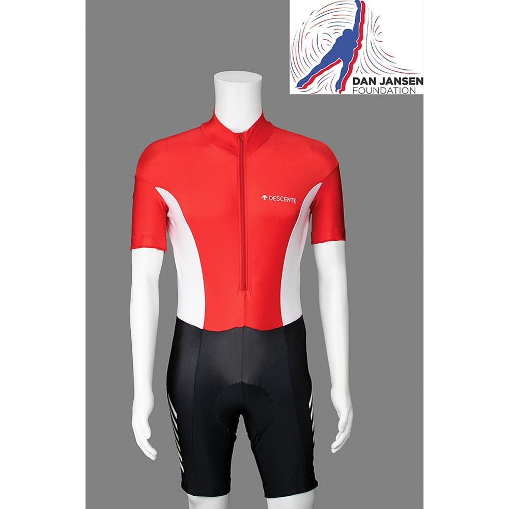 Dan Jansen's personally-owned and -worn cycling suit that he used while training for the Winter Olympics. The nylon/spandex cycling suit, or skinsuit, is size large and made by Descente of Japan. In fine, used condition. A veteran of four Winter Olympiads—Sarajevo 1984, Calgary 1988, Albertville 1992, and Lillehammer 1994—Jansen broke a ten-year Olympic jinx when he won a gold medal in the 1,000 meters in his final speed skating race.