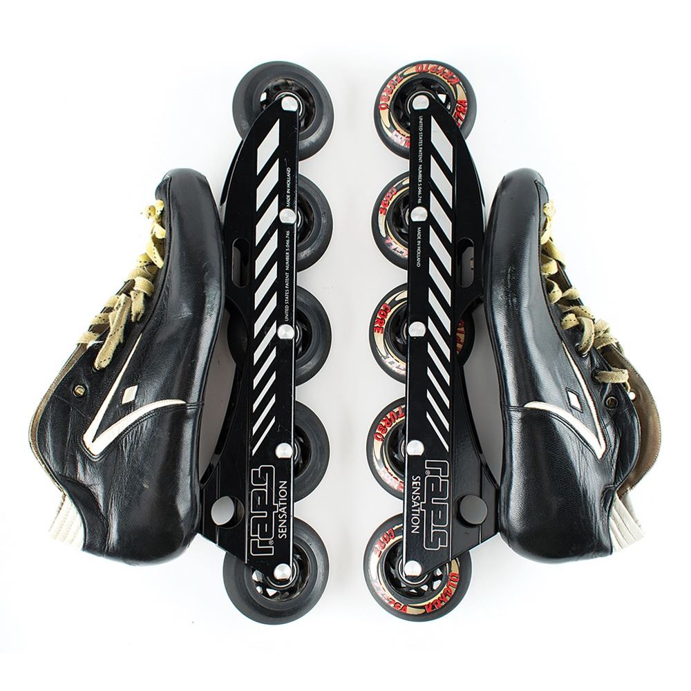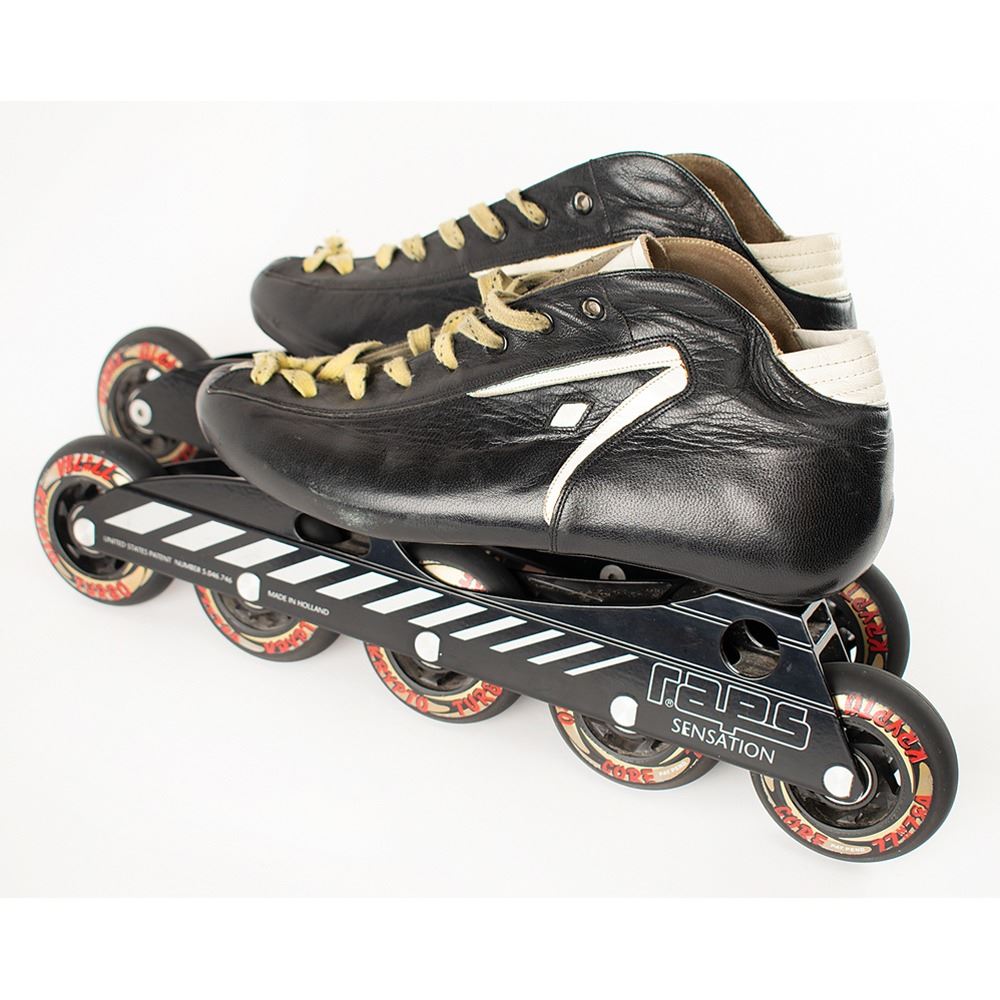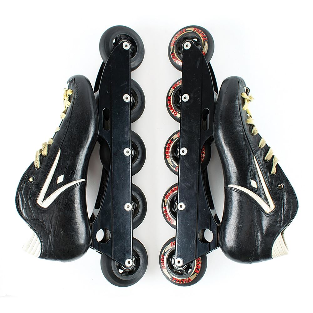 Dan Jansen's personally-owned and -worn pair of inline speed skates and ankle booties that he used during Team USA Olympic training sessions. The black Raps Sensation inline speed skates, size unknown, feature the original beige laces and five Krypto Turbo Core 77 mm 78A wheels. Also included is a set of five Mizuno ankle booties, a still-sealed 10-pack of orange Bauer Hyper 76 mm 78A wheels, a zippered Mizuno carrying bag, and five black vinyl Mizuno package envelopes, one of which is annotated “12. Jansen, 98-6.†In overall fine condition, with wear from use to skates, and some marks to the carrying bag.