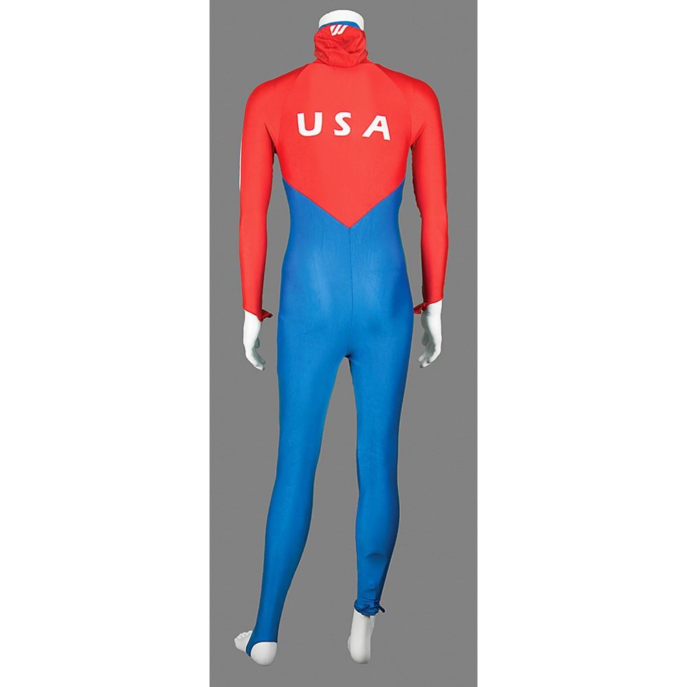 Dan Jansen's personally-owned speed skating uniform that he wore as a member of Team USA. Made by Mizuno, the hooded uniform is likely size large or extra-large and features a wonderfully patriotic American flag design with a zipper to the chest area, “USA†across the back, and an American emblem to the left chest. In fine, well-used condition.