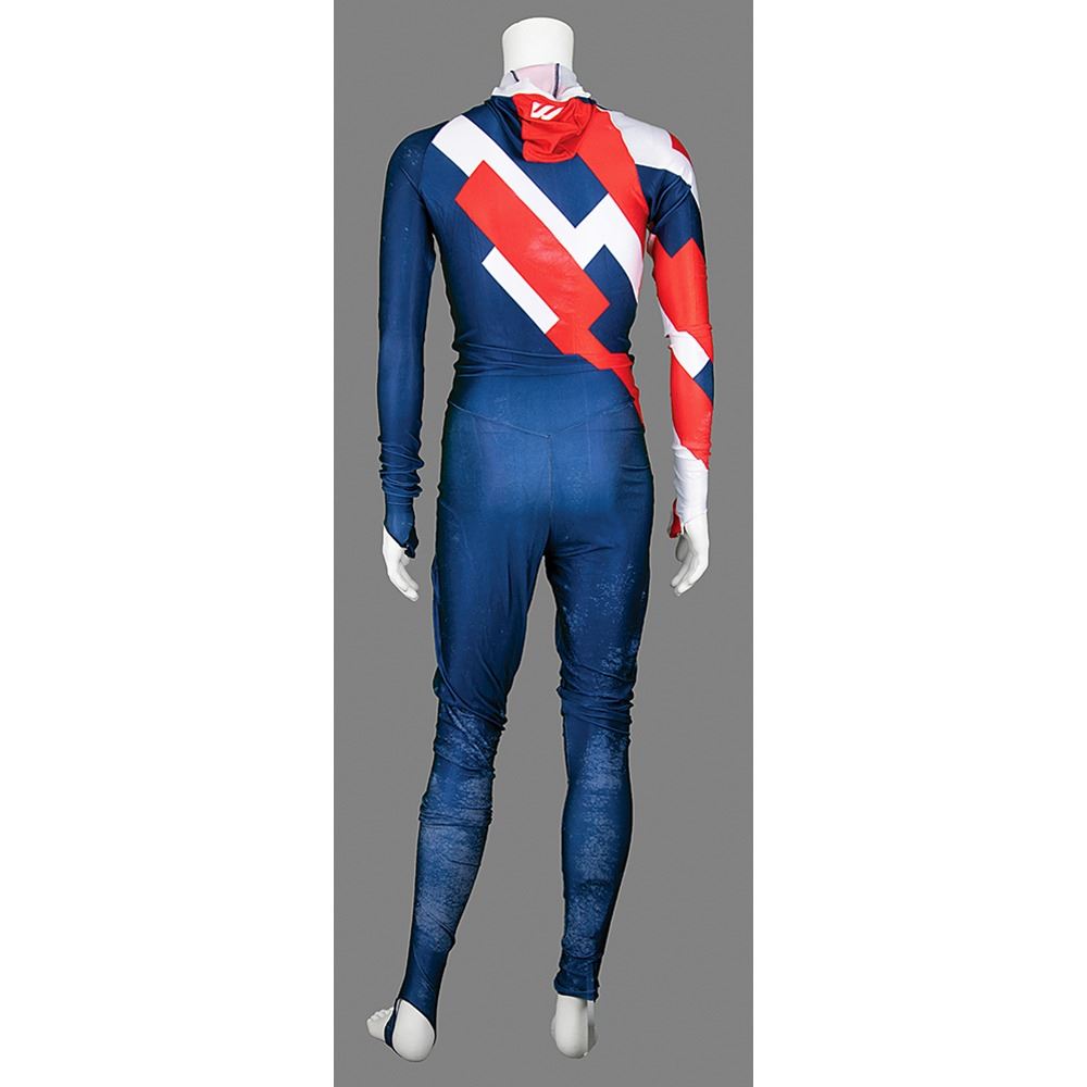 Dan Jansen's personally-owned speed skating uniform that he wore as a member of Team USA. Made by Mizuno, the hooded extra-large uniform features a wonderfully patriotic American flag design with a zipper to the chest area, and “USA†to the left chest and the front right leg. In fine, well-used condition, with overall scattered rubbing and scuffs, most noticeably to the lower half.