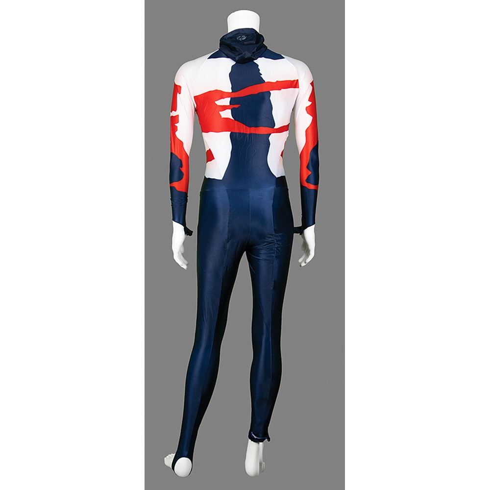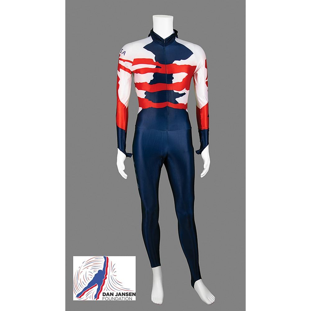 Dan Jansen's personally-owned speed skating uniform that he wore as a member of Team USA. Made by Mizuno, the hooded uniform is size extra-large and features a handsome patriotic American flag design with a zipper to the chest area and “USA†to the right shoulder and front right leg. In fine, well-used condition.