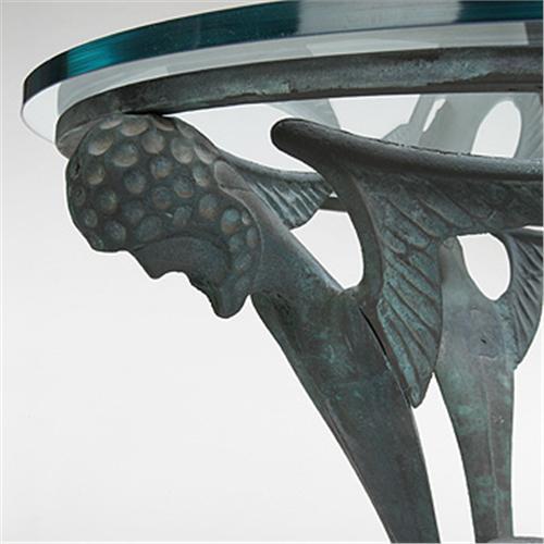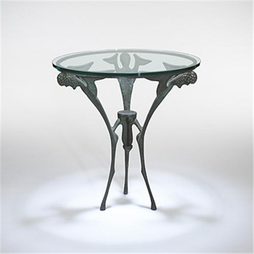 Dan Johnson side table Dan Johnson Studio USA, c. 1958 bronze, glass 26"dia x 28.25"h The individuality and quality of Johnson's metalwork are comparable to Alberto Giacometti. Johnson's exquisite furniture was produced in extremely rare quantities.Provenance: Glen Baker, Palos Verdes, California Private collection