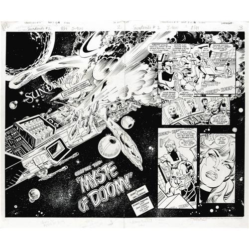 <B>Dan Jurgens and Romeo Tanghal - Sun Devils #2 Original Art Group of 10 (DC, 1984).</B></I> Featuring a dramatic double-page splash, this group includes pages #1, 2, 3, 8, 9, 10, 11, 13, 14, and 15. Wonderful space-adventure action from Dan Jurgens. The two-page spread is a bit narrower than the other pages as it has no center margins, the other pages all measure 13" x 20". The artwork is all in Very Good condition.