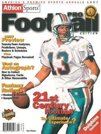 This is an Athlon Sports 1997 Pro Football Magazine with Miami Dolphins Hall of Fame Quarterback Dan Marino on the cover. This Preview has team analysis, predictions, lineups, rosters and more for the 1997 Season