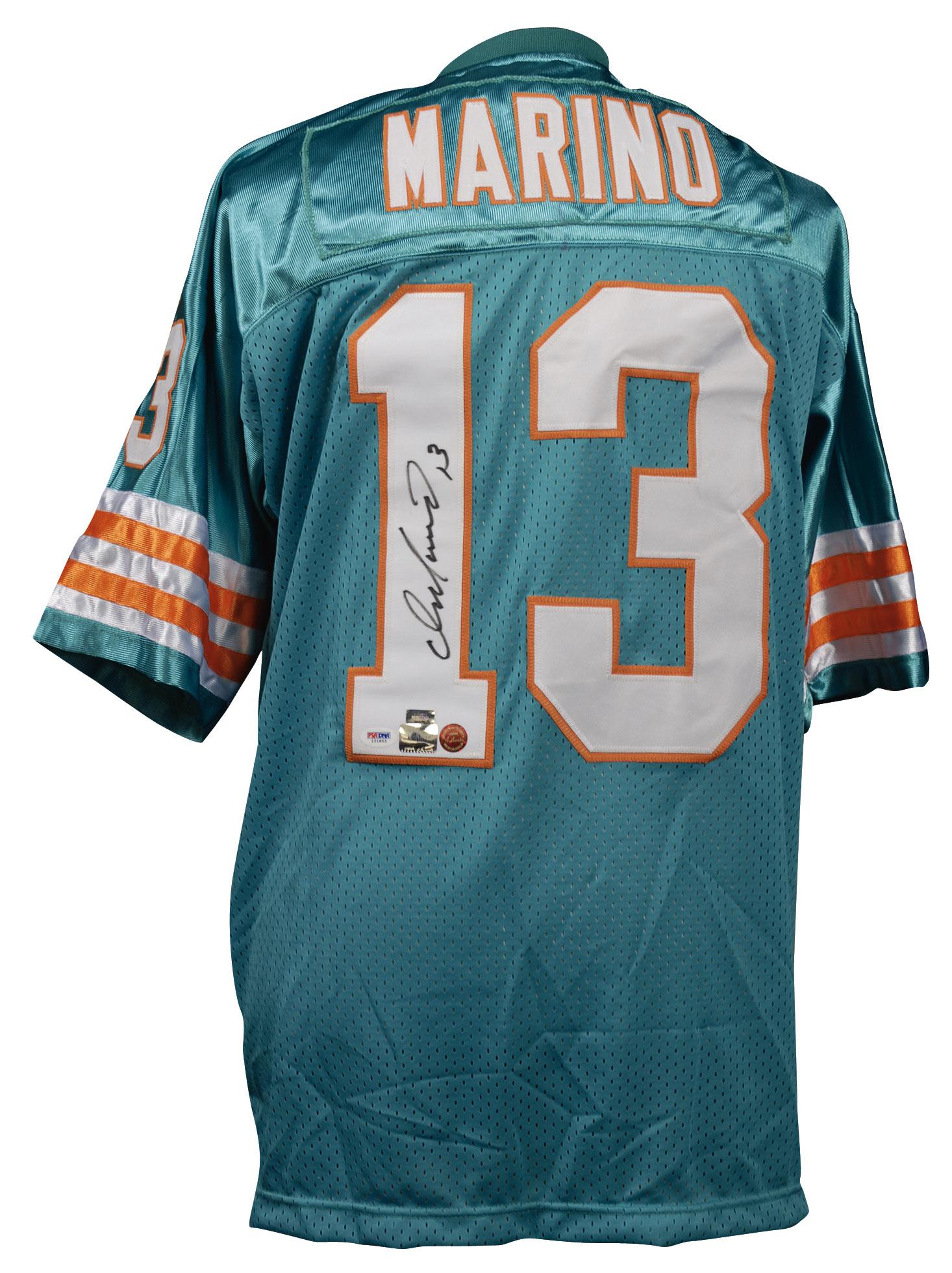 Official replica Miami Dolphins football jersey, with sewn on letters and numbers, signed in black felt tip on the number on the back, “Dan Marino 13.” A PSA/DNA authentication label and three other authentication labels affixed to number. In very fine condition. Pre-certified Steve Grad/PSA/DNA and RRAuction COA.