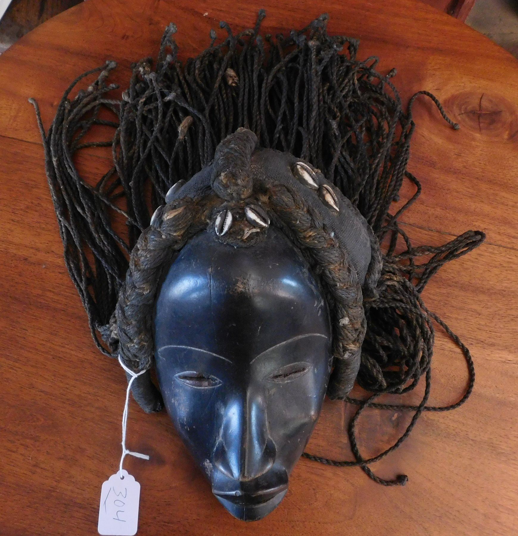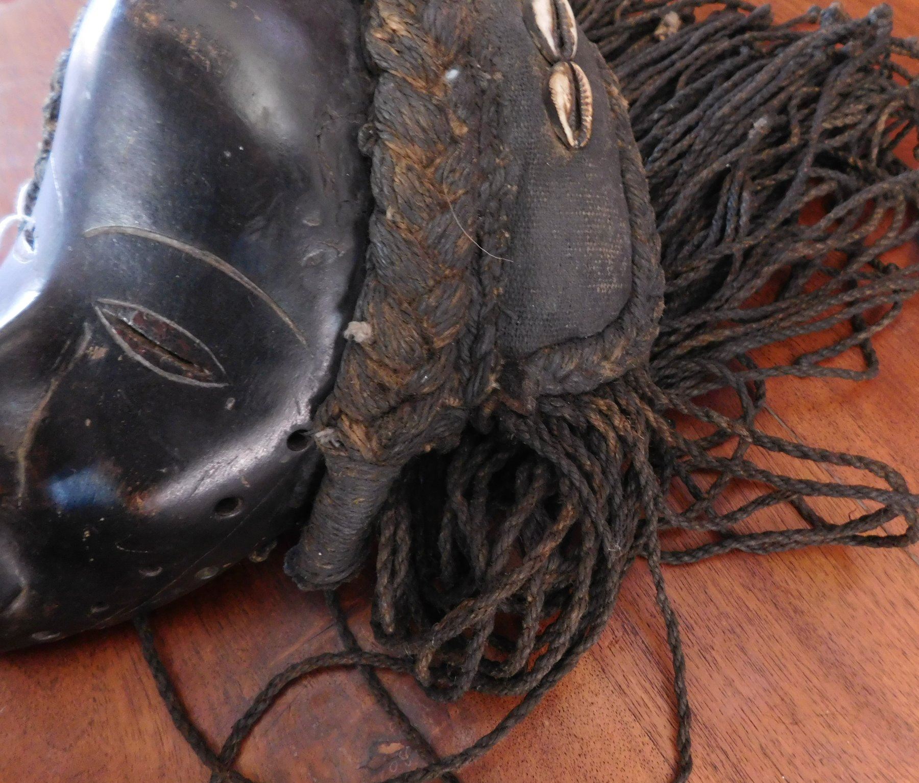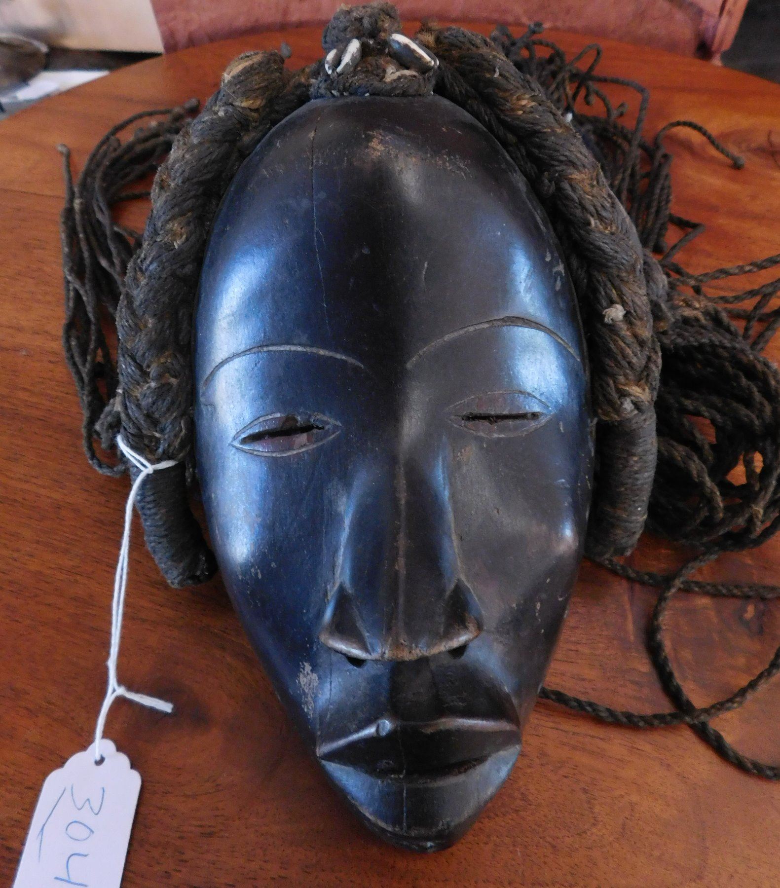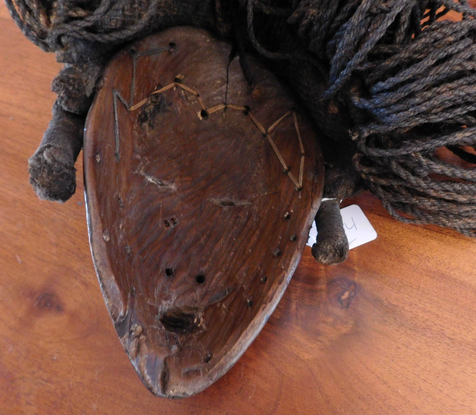 Dan Mask, 20th century item. Made of wood and raffia, the item measures 9" x 8". Ivory Coast. Condition: Wear, danced, see images. Shipping: $25.50 w/insurance and signature.