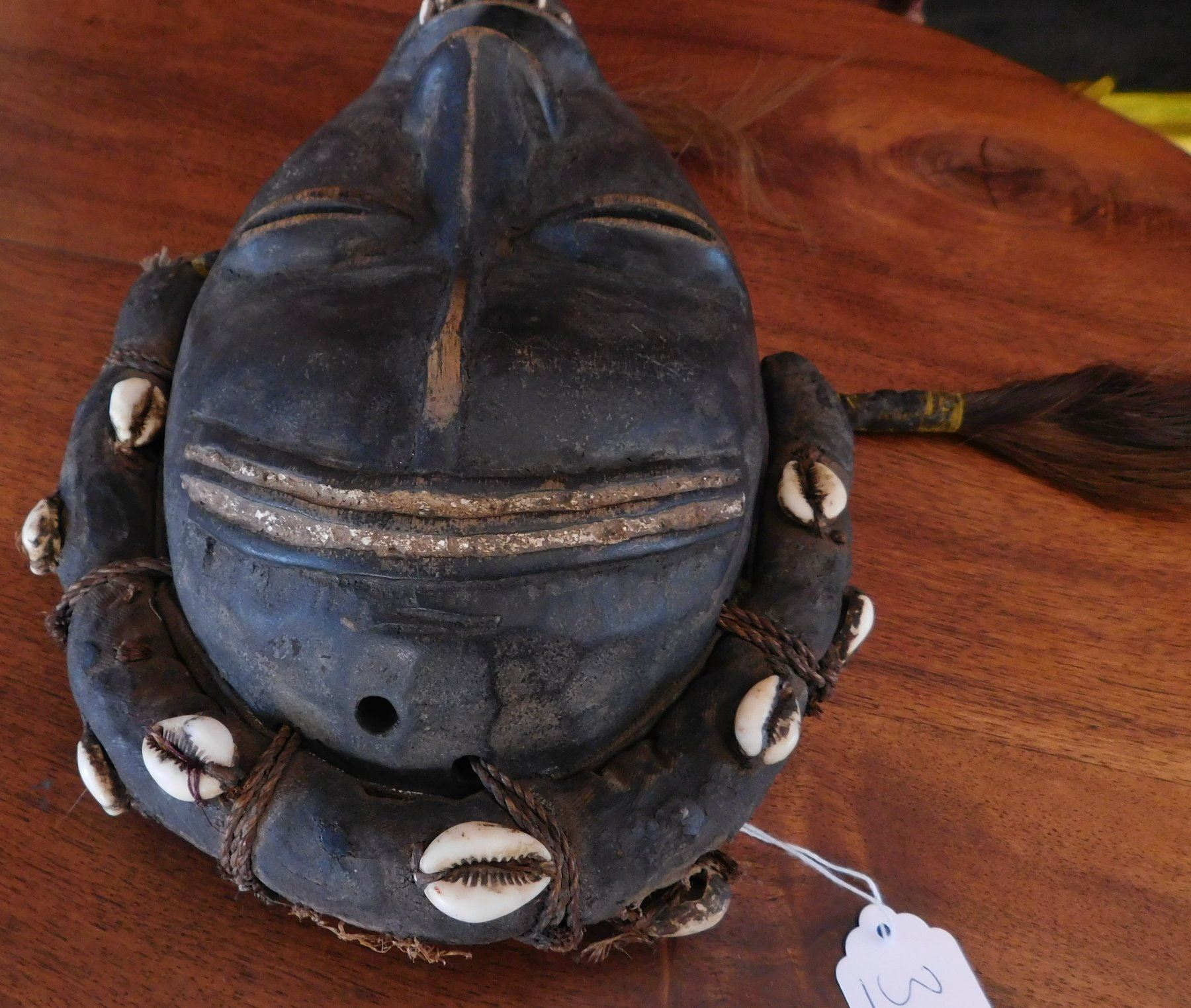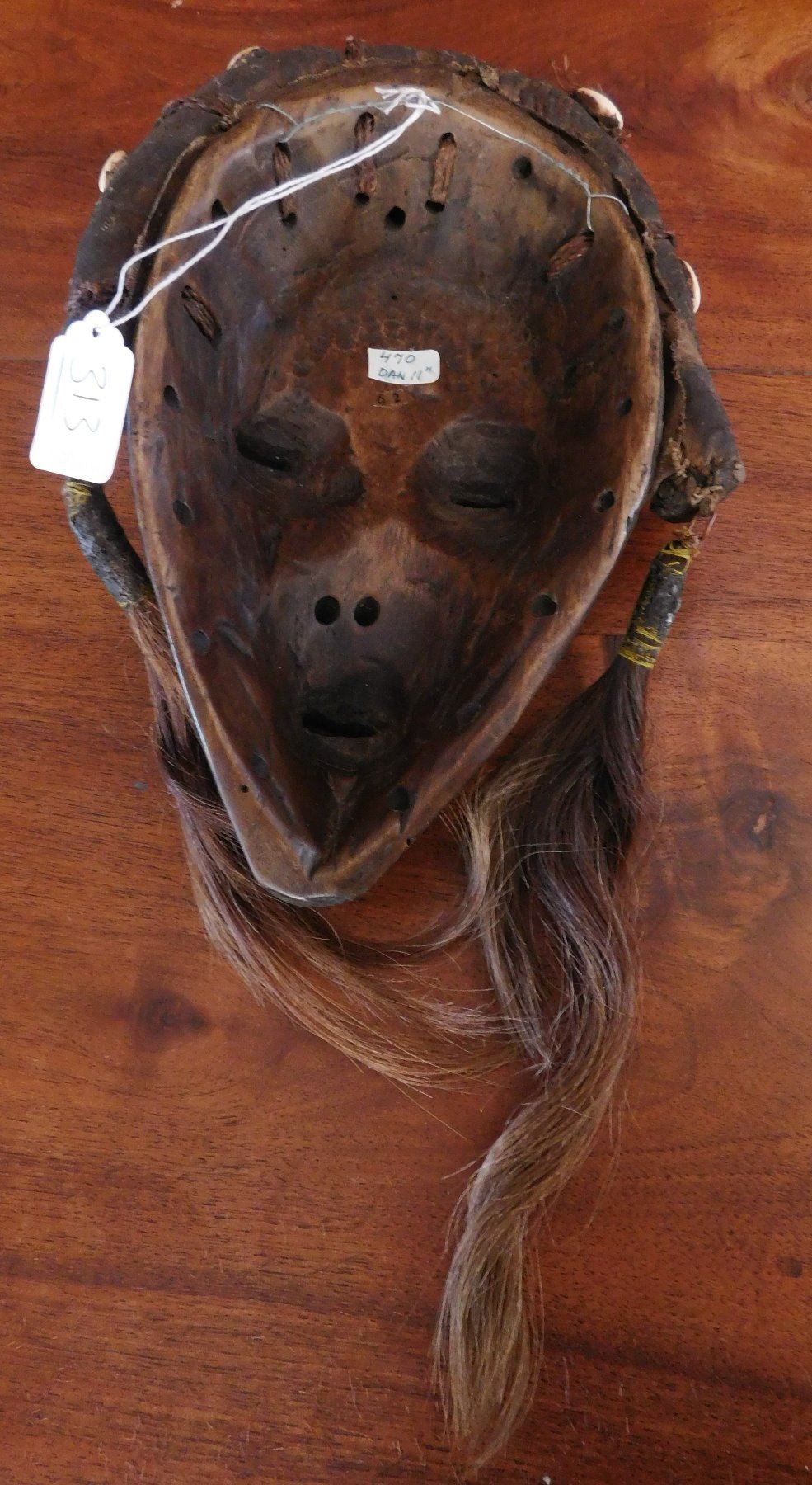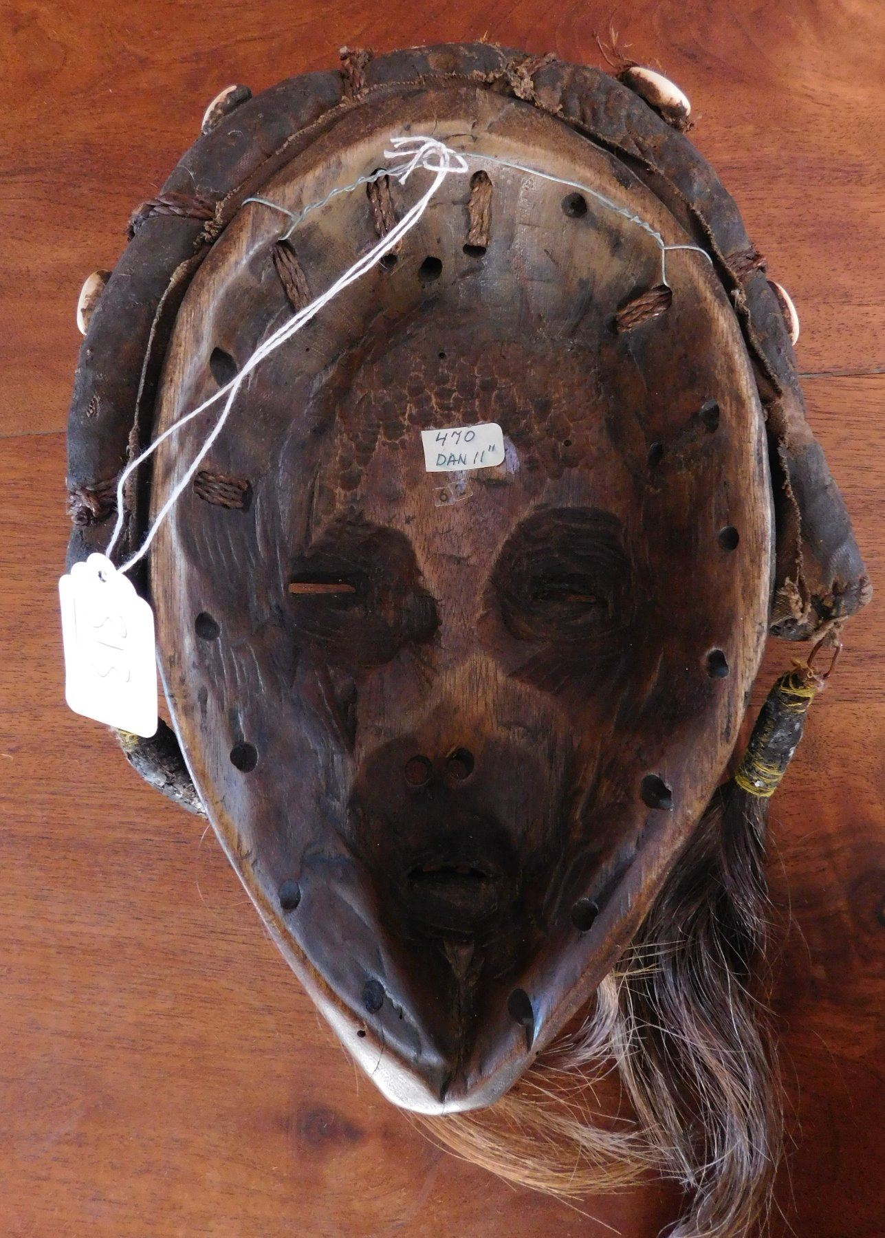 Dan Mask, early 20th century item. Made of wood, cowrie shells and hair, the item measures 11" x 7" x 2". Ivory coast. Condition: Good, minor wear, see images. Shipping: $20.50 w/insurance and signature.