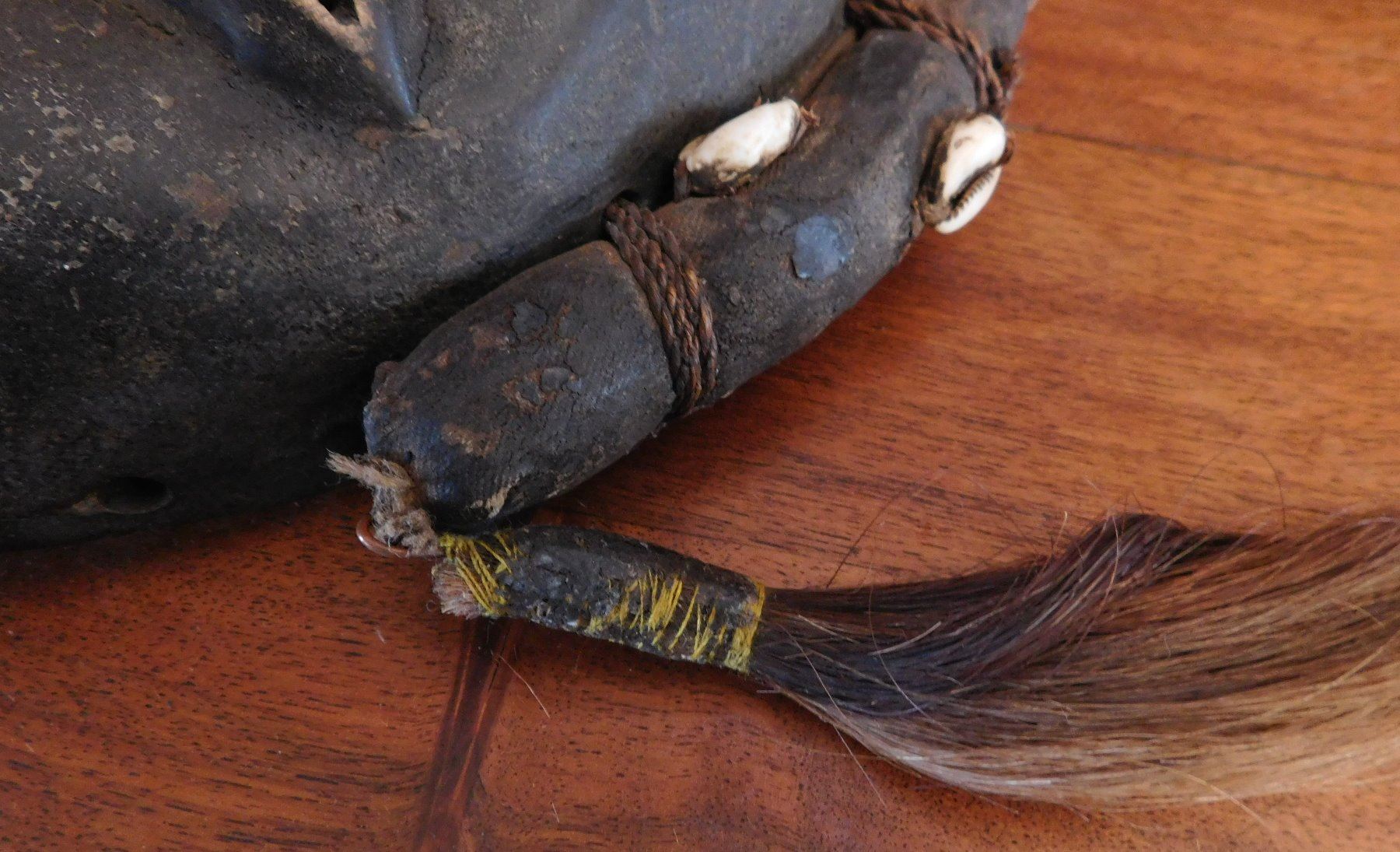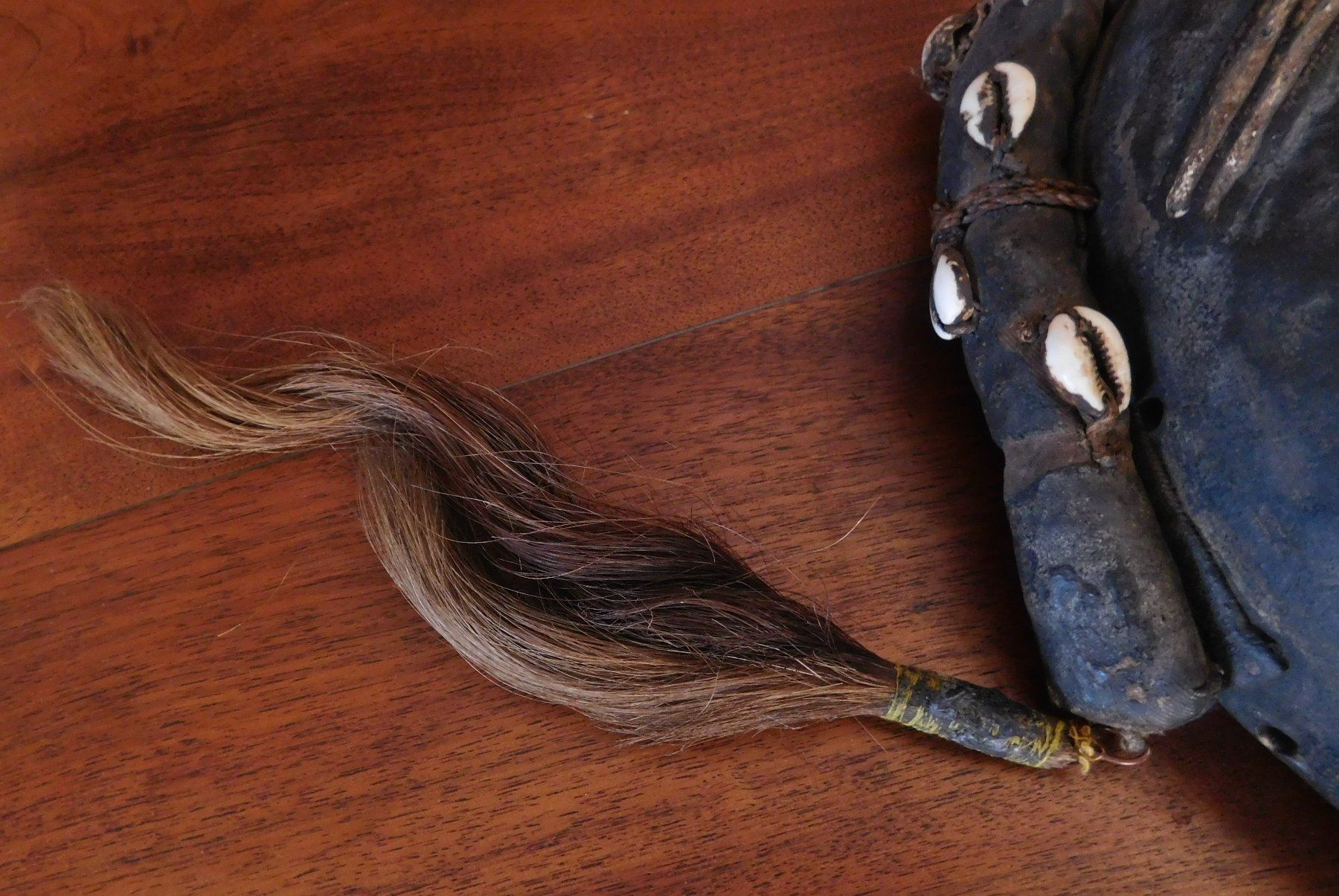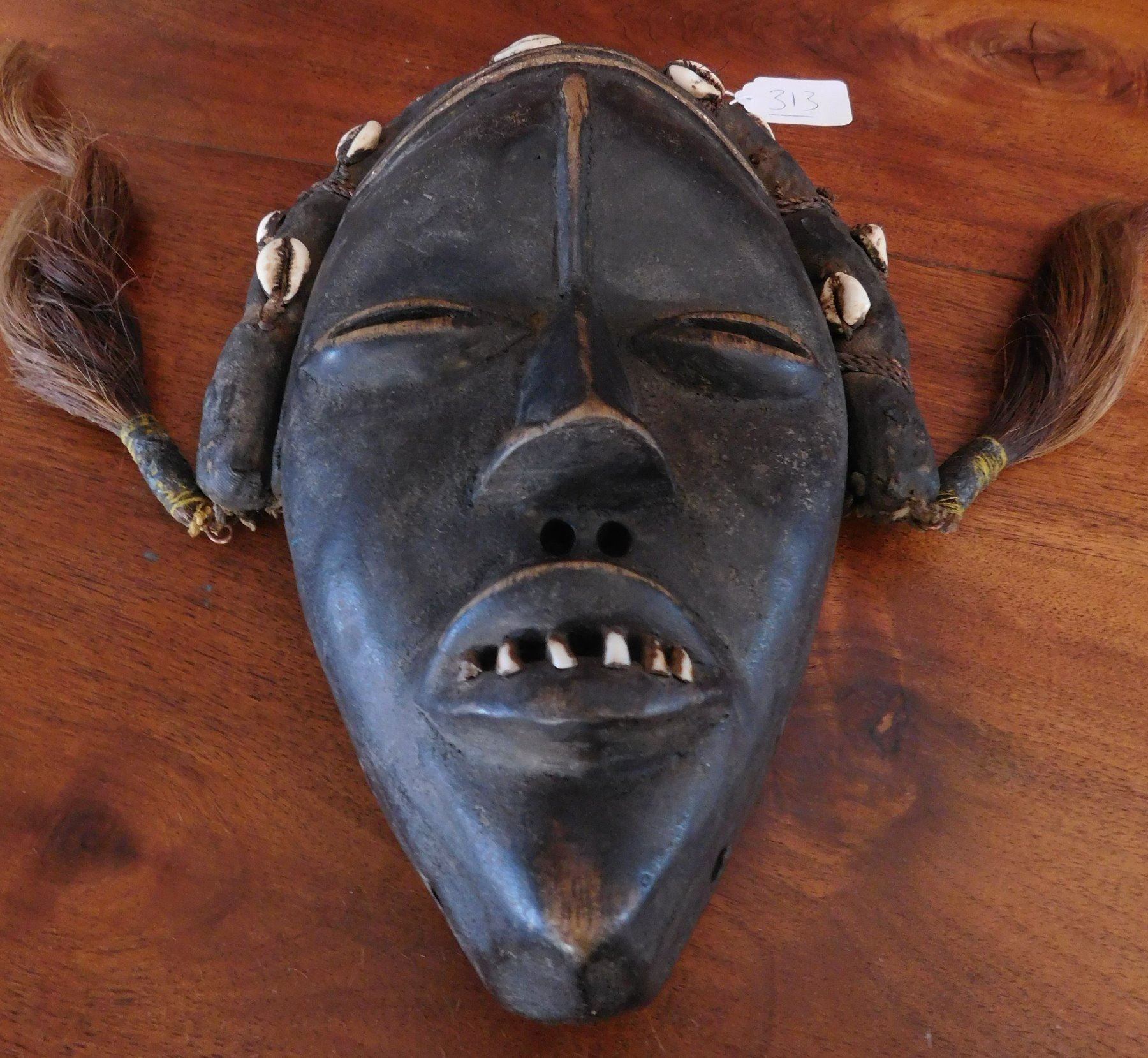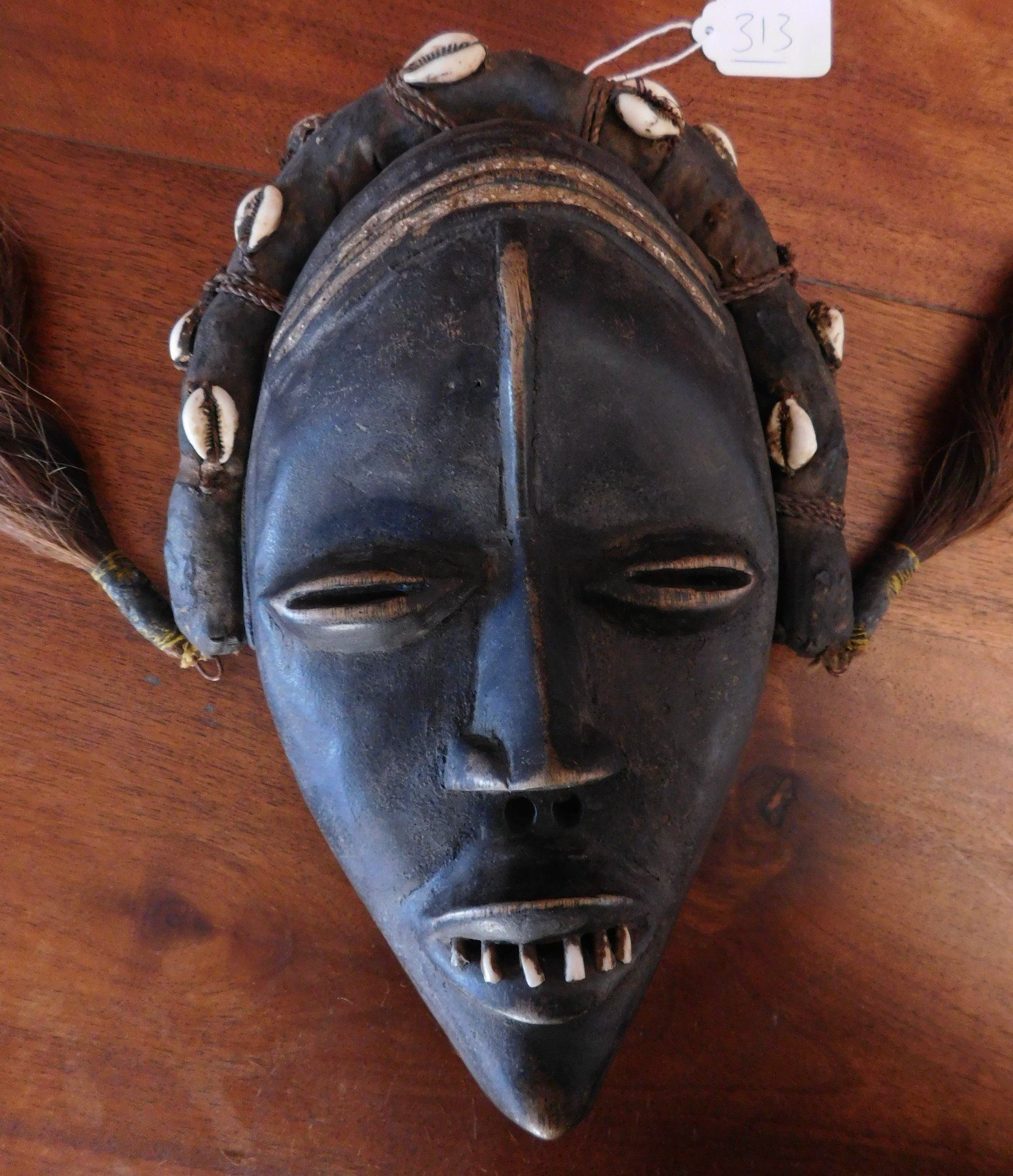Dan Mask, early 20th century item. Made of wood, cowrie shells and hair, the item measures 11" x 7" x 2". Ivory coast. Condition: Good, minor wear, see images. Shipping: $20.50 w/insurance and signature.