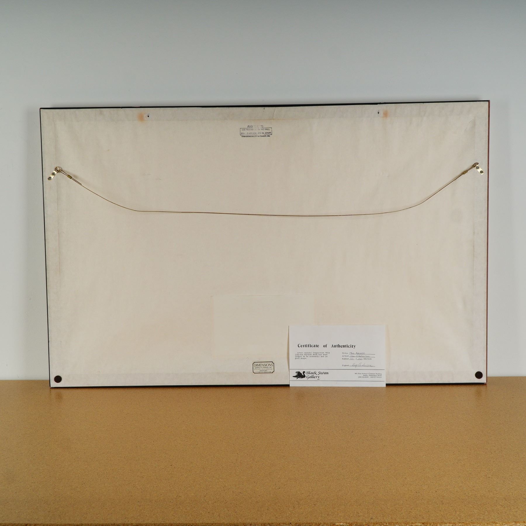Presented is a striking lithograph on Stonehenge paper by American artist Dan O'Halloran, titled The Archer. The composition is rich in detail, featuring a finely dressed archer in dialogue with a kingfisher against a backdrop of stylized mountains, with prominent red seal impressions enhancing its balance of East Asian aesthetic and Western draftsmanship. O'Halloran's meticulous rendering and textural approach demonstrate his deep study of classical techniques while reinterpreting traditional themes for a modern audience. Dan O'Halloran is known for his evocative lithographs that blend historical and cultural narratives with masterful technique, earning recognition among collectors of fine limited-edition works. This limited edition lithograph is hand-numbered 50/250 in graphite at the lower left and signed by the artist at the lower right. Certificate of Authenticity included.