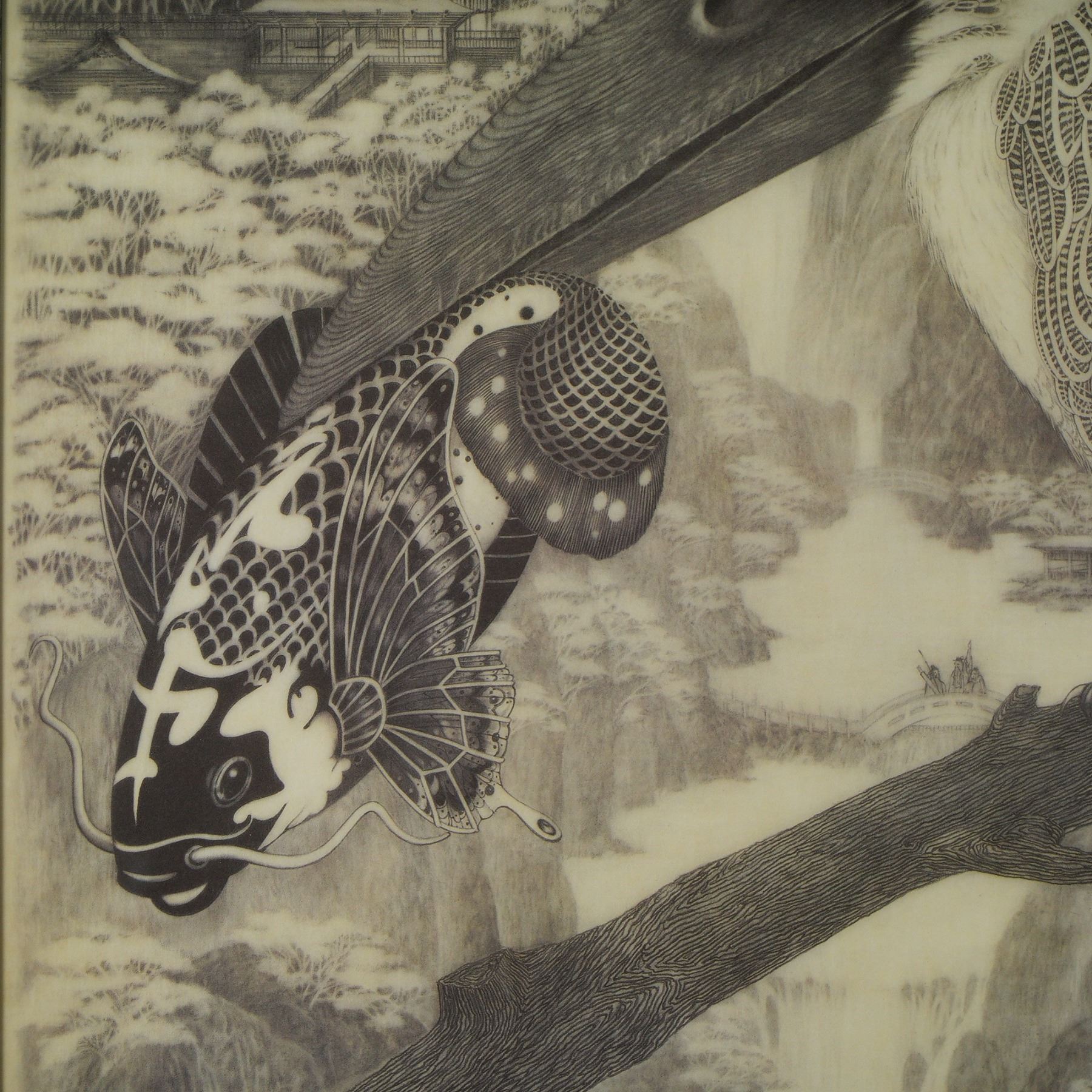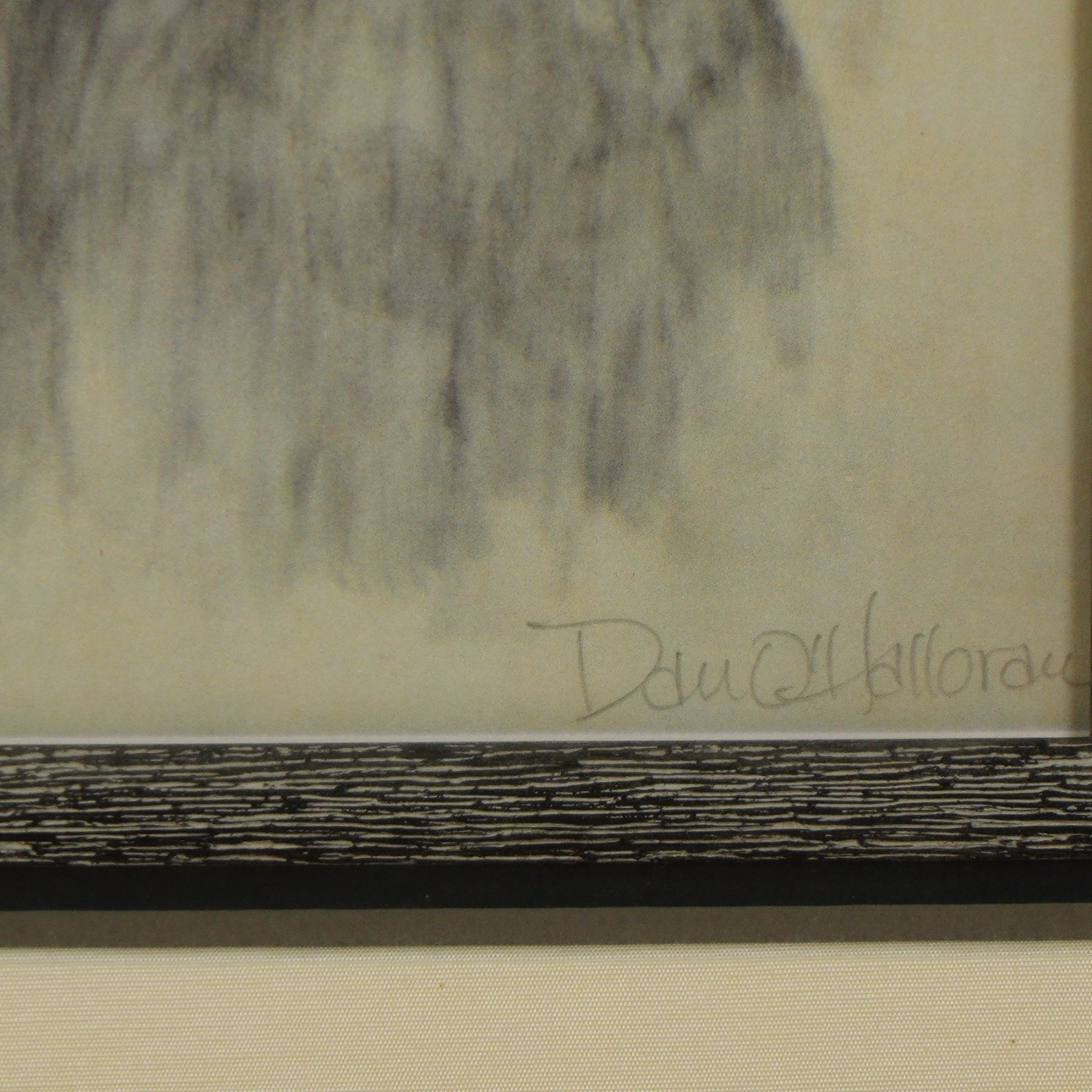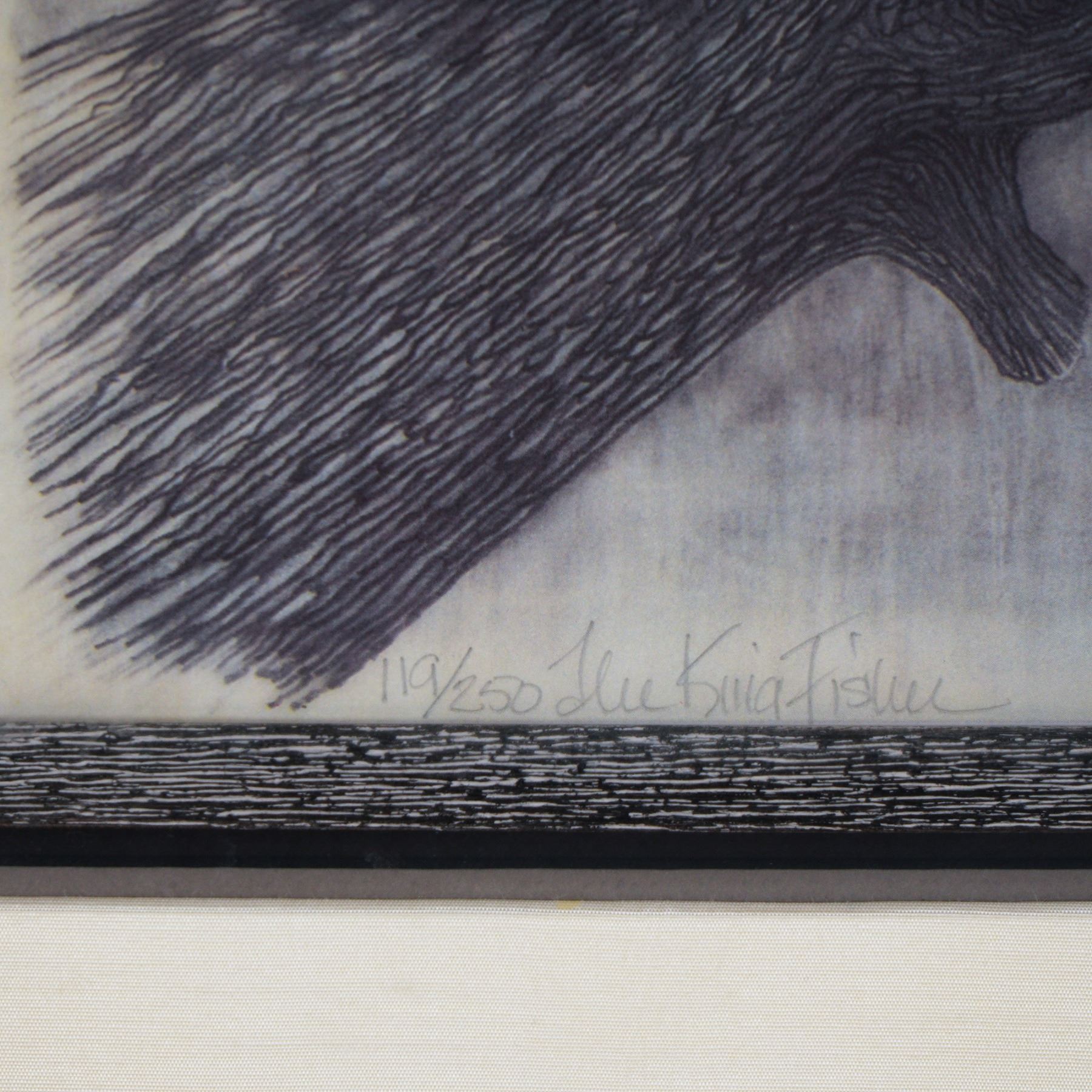 Outstanding limited edition lithograph on Stonehenge paper by contemporary American artist Dan O'Halloran, titled The King Fisher. This work showcases O'Halloran's extraordinary fusion of realism and intricate detail, featuring a majestic kingfisher rendered with elaborate linear and textural patterns against a traditional Asian-inspired landscape. The piece incorporates Chinese calligraphy and red seal marks, bridging cultural influences while highlighting the artist's fascination with natural subjects and symbolic imagery. The lithograph exemplifies O'Halloran's dedication to fine craftsmanship and conceptual depth. Dan O'Halloran is known for his highly detailed works that blend Eastern and Western aesthetics, often exploring the intersection of wildlife, symbolism, and spirituality. Presented under glass in a gilt frame with cream matting, this edition reflects both rarity and artistic mastery, making it a highly desirable collector's piece. Numbered 119/250, signed in graphite lower right and titled in graphite lower left.