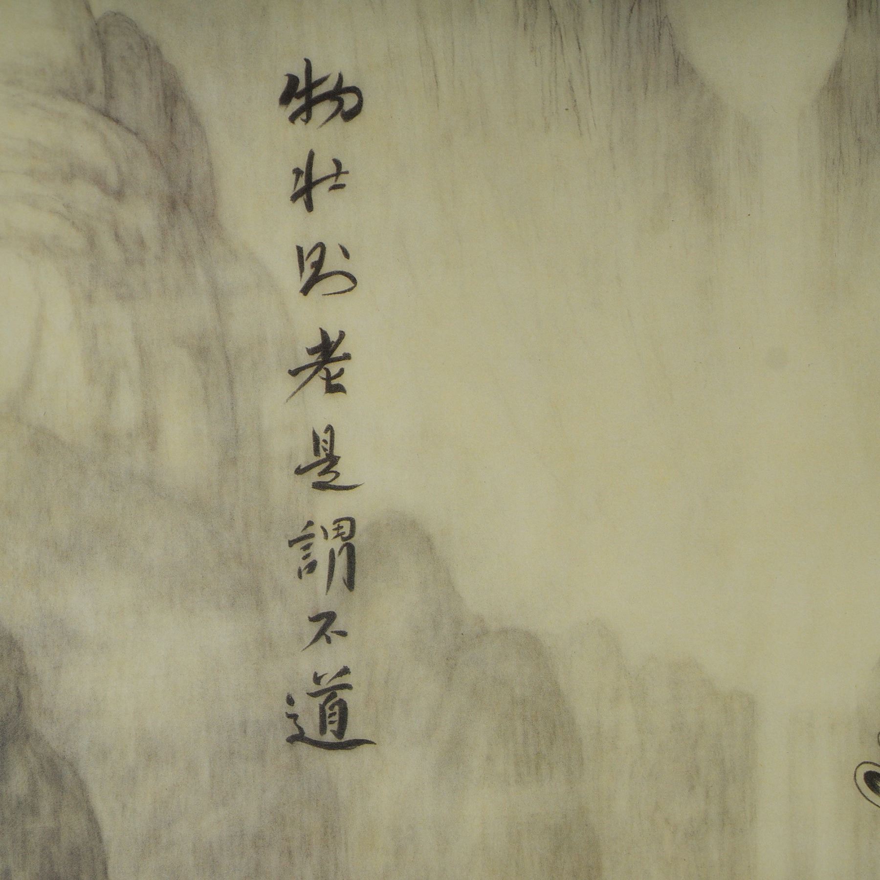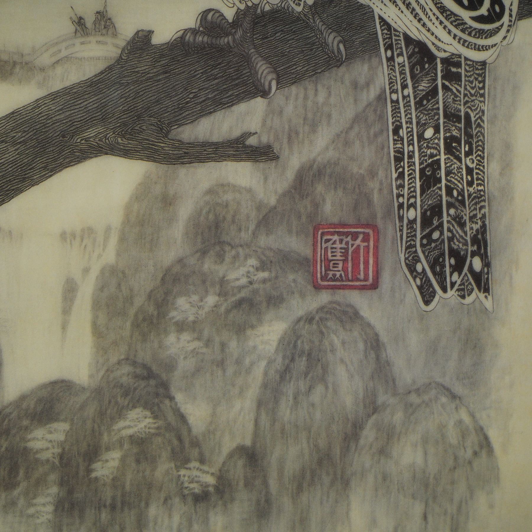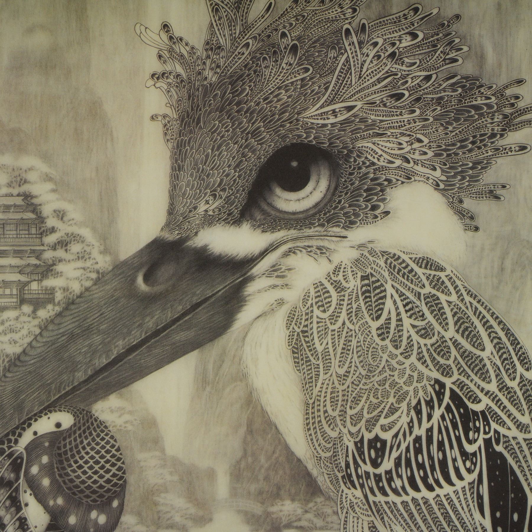 Outstanding limited edition lithograph on Stonehenge paper by contemporary American artist Dan O'Halloran, titled The King Fisher. This work showcases O'Halloran's extraordinary fusion of realism and intricate detail, featuring a majestic kingfisher rendered with elaborate linear and textural patterns against a traditional Asian-inspired landscape. The piece incorporates Chinese calligraphy and red seal marks, bridging cultural influences while highlighting the artist's fascination with natural subjects and symbolic imagery. The lithograph exemplifies O'Halloran's dedication to fine craftsmanship and conceptual depth. Dan O'Halloran is known for his highly detailed works that blend Eastern and Western aesthetics, often exploring the intersection of wildlife, symbolism, and spirituality. Presented under glass in a gilt frame with cream matting, this edition reflects both rarity and artistic mastery, making it a highly desirable collector's piece. Numbered 119/250, signed in graphite lower right and titled in graphite lower left.