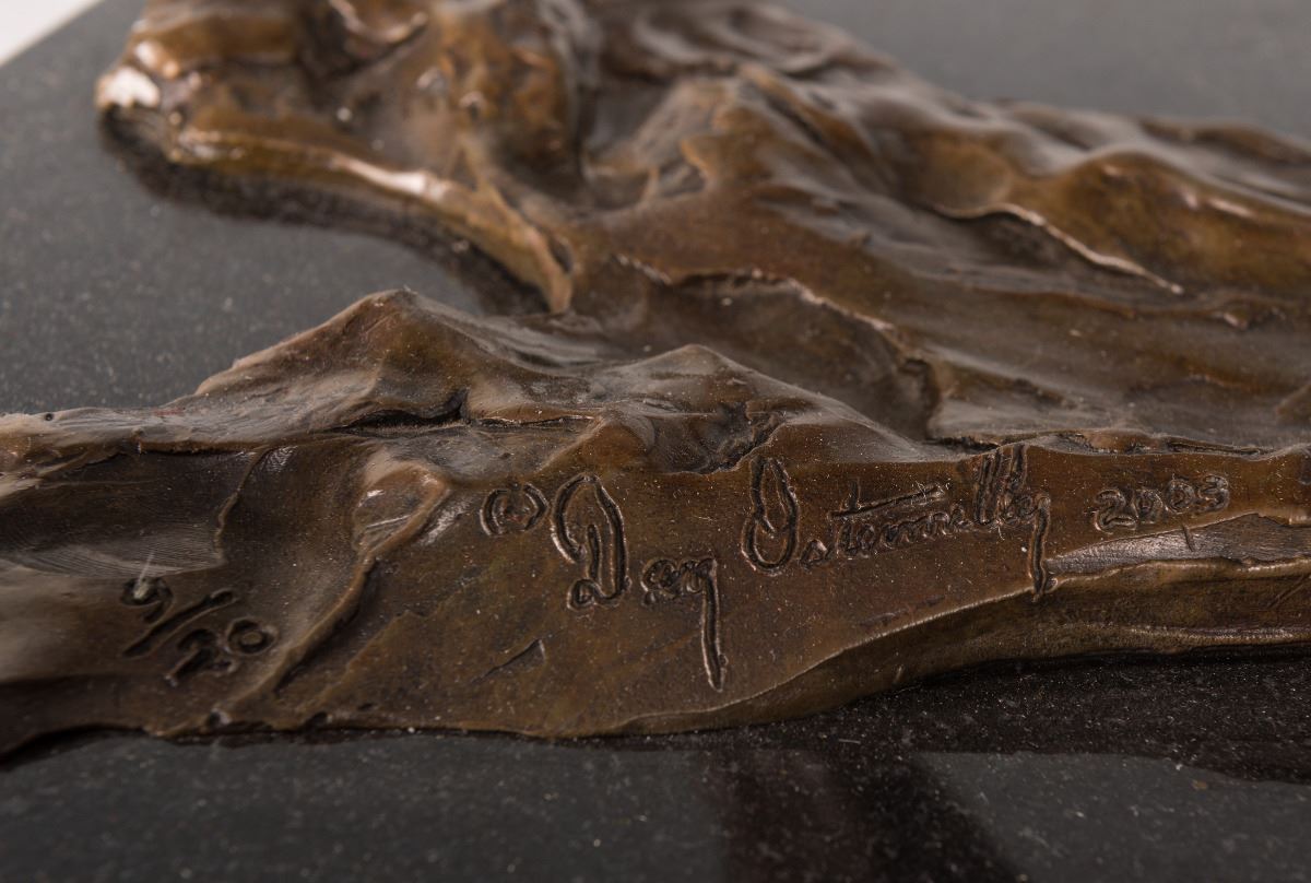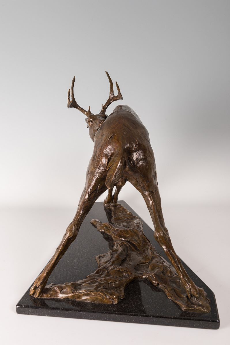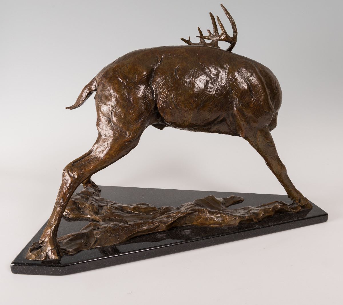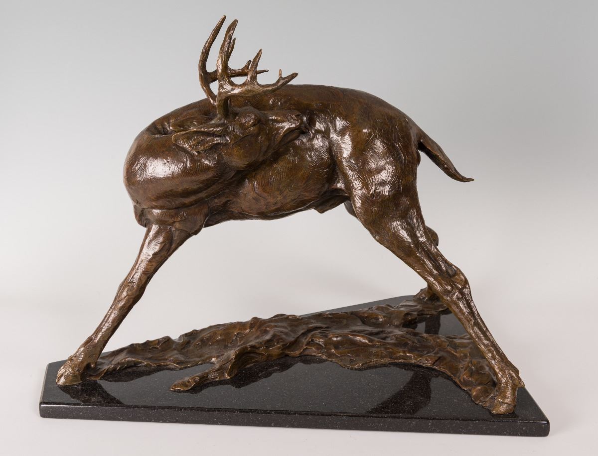 Dan Ostermiller (1956 - ). Preening Whitetail. 14 ½" x 19" x 13" bronze on marble base. Inscribed: Dan Ostermiller © 9/20, 2003.