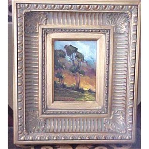 This is contemporary plein air style oil on board painting by California artist Dan Persinger. It features a brilliant late afternoon sunset with eucalyptus trees in the foreground. It is in a modern frame. The painting measures 6" high by 5" wide. This is a fast growing field of young painters doing vintage style work with a modern touch. Very collectible and sure to increase in value. A good place for young collectors to enter the art market.