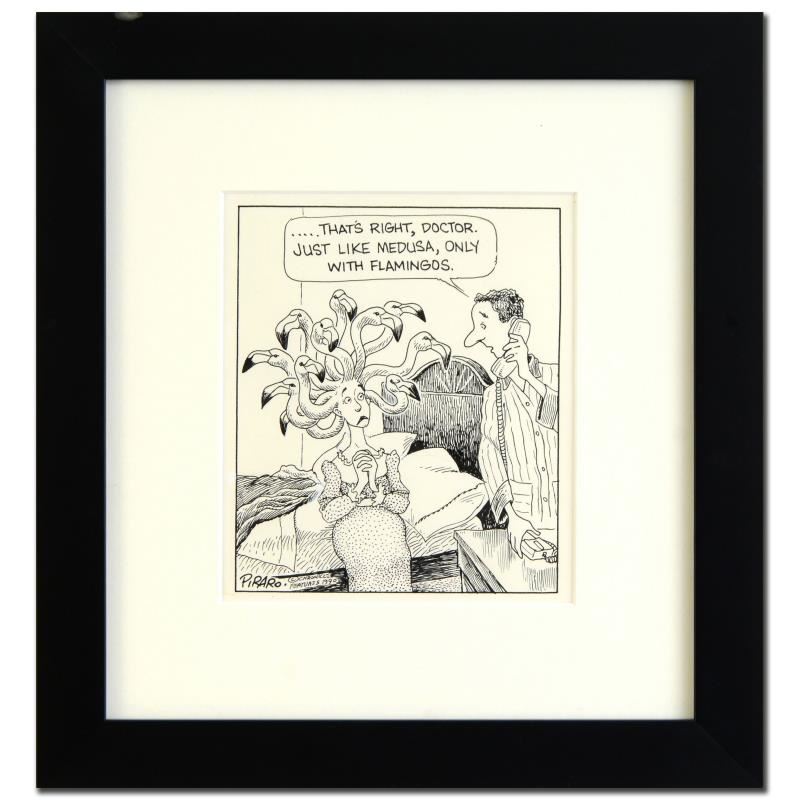 Enter a surreal and satirical world of twisted imagination and award winning creativity. "Flamingo Medusa" is an original pen & ink drawing on paper by Dan Piraro, creator of the critically acclaimed and award winning comic strip, Bizarro! This piece is hand signed and comes framed. Includes Certificate of Authenticity! Measures approx. 13" x 14" (with frame), 6" x 7" (image). ** Please note: there is a chip in the frame at the top-left corner. **