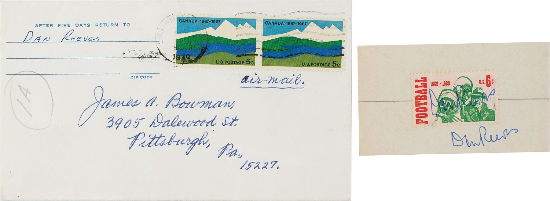Two ballpoint signatures, "Dan Reeves,” one on an off-white 3.5 x 2 card, and the other on a postage stamp honoring the centennial of football affixed at the center of the card. In very fine condition. Accompanied by the original mailing envelope.