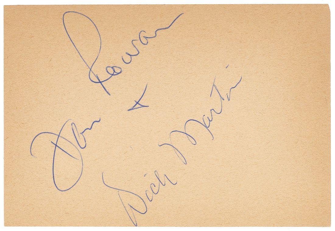 Ballpoint signatures, “Dan Rowan” and “Dick Martin” on an off-white 5.5 x 3.75 sheet. In fine condition, with mild uniform toning.