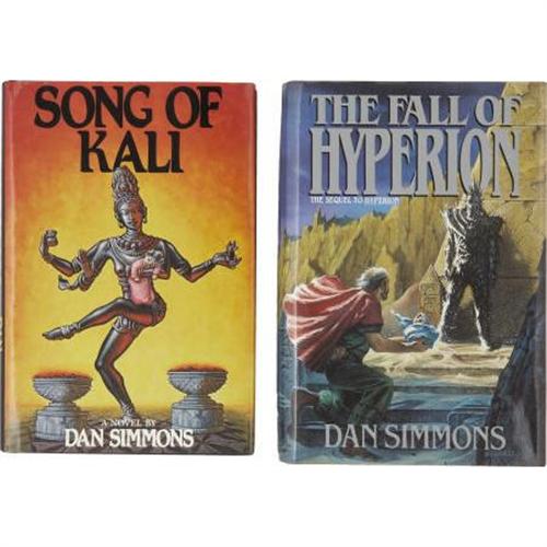 <B>Dan Simmons. Two First Editions, One Signed</B></I>, including: <B><I>Song of Kali</B></I></B></I>. New York: Bluejay Books, 1985. Octavo. 311 pages. Black cloth with gilt spine titles. Overall, book and dust jacket are fine. [and:] <B><I>The Fall of Hyperion</B></I></B></I>. New York: Doubleday, 1990. Inscribed and signed by the author on the title page. Octavo. 517 pages. Quarter brown cloth over lavender paper boards. Gilt spine titles. Includes an errata notice pertaining to pages 305 and 306. Overall, book and dust jacket are fine. <I>From the Robert and Diane Yaspan Collection.</B></I><BR><BR><b>Shipping:</b> Books & Catalogs (<a target="_blank" href="http://www.heritageauctions.com/common/shipping.php">view shipping information</a>)
