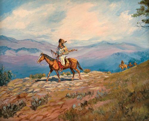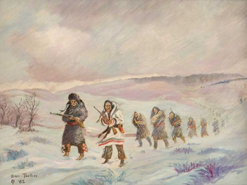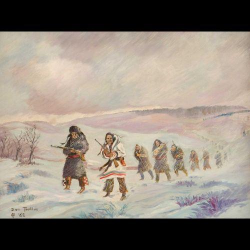Dan Taulbee (b. 1924). Two Oils. 1. 24" x 30. Oil on Canvas. Signed LL. 2. 18" x 24". Oil on Board. "Return to the Rosebud" Signed LR. Dated 62. (est $1,000-2,000). Provenance: MAC Museum, Spokane, Washington.