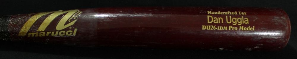Custom engraved Marucci DU26-LDM Pro Model Baseball Bat. Barrel is custom engraved with "Handcrafted For Dan Uggla." Bat has been used in an MLB game by Dan Uggla (Atlanta Braves). The bat has been cracked on the handle. The bat includes an LOA and lifetime authenticity guarantee from Pristine Auction.