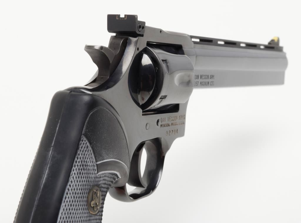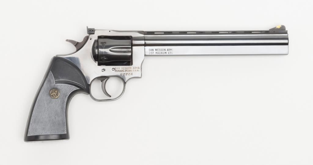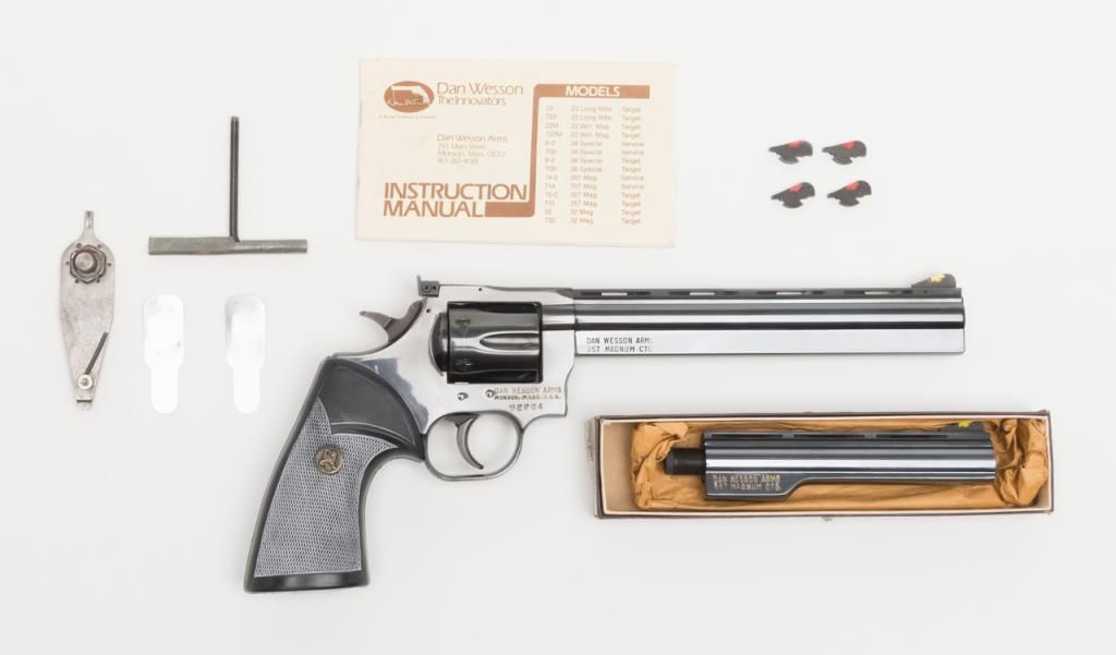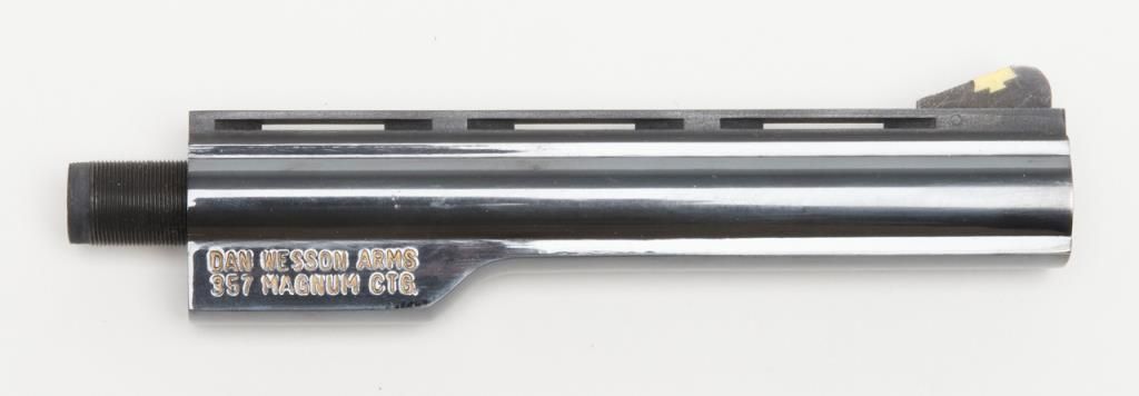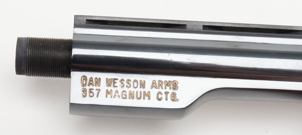Dan Wesson DA revolver, .357 Magnum cal., 8” ventilated rib barrel, blue finish, Pachmayr combat checkered hard rubber grips, #92704 in overall fine condition showing a very good to fine bore, crisp action, sharp markings, very goodgrips; accompanied by an extra 6” ventilated rib barrel in factory cardboard box in fine condition with fine bore, instructions manual and tools. (Modern/PPT). Est.: $300-$600.