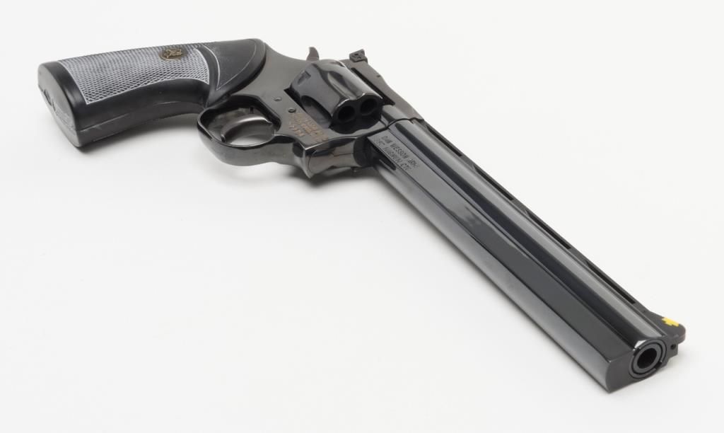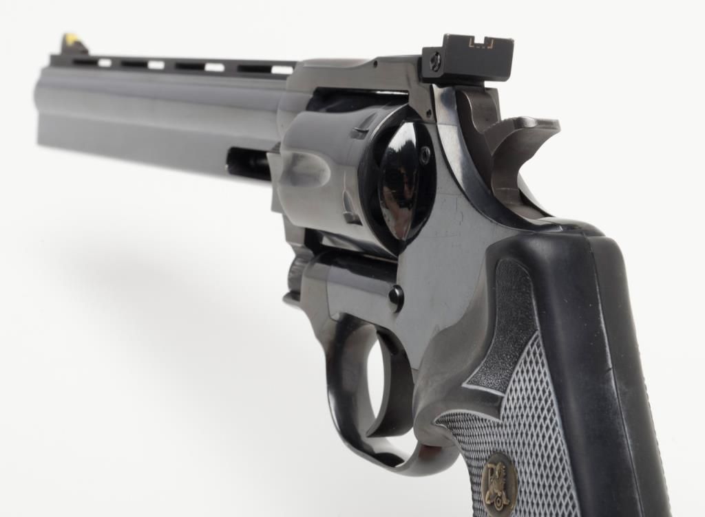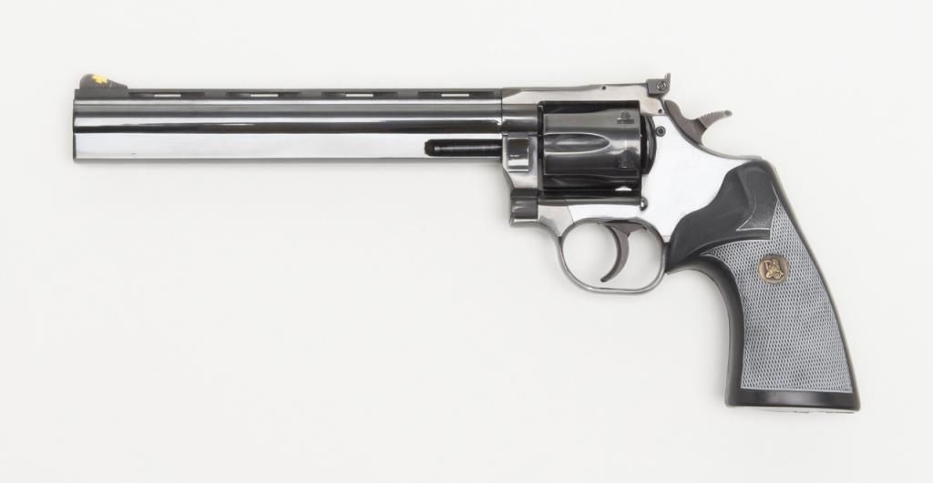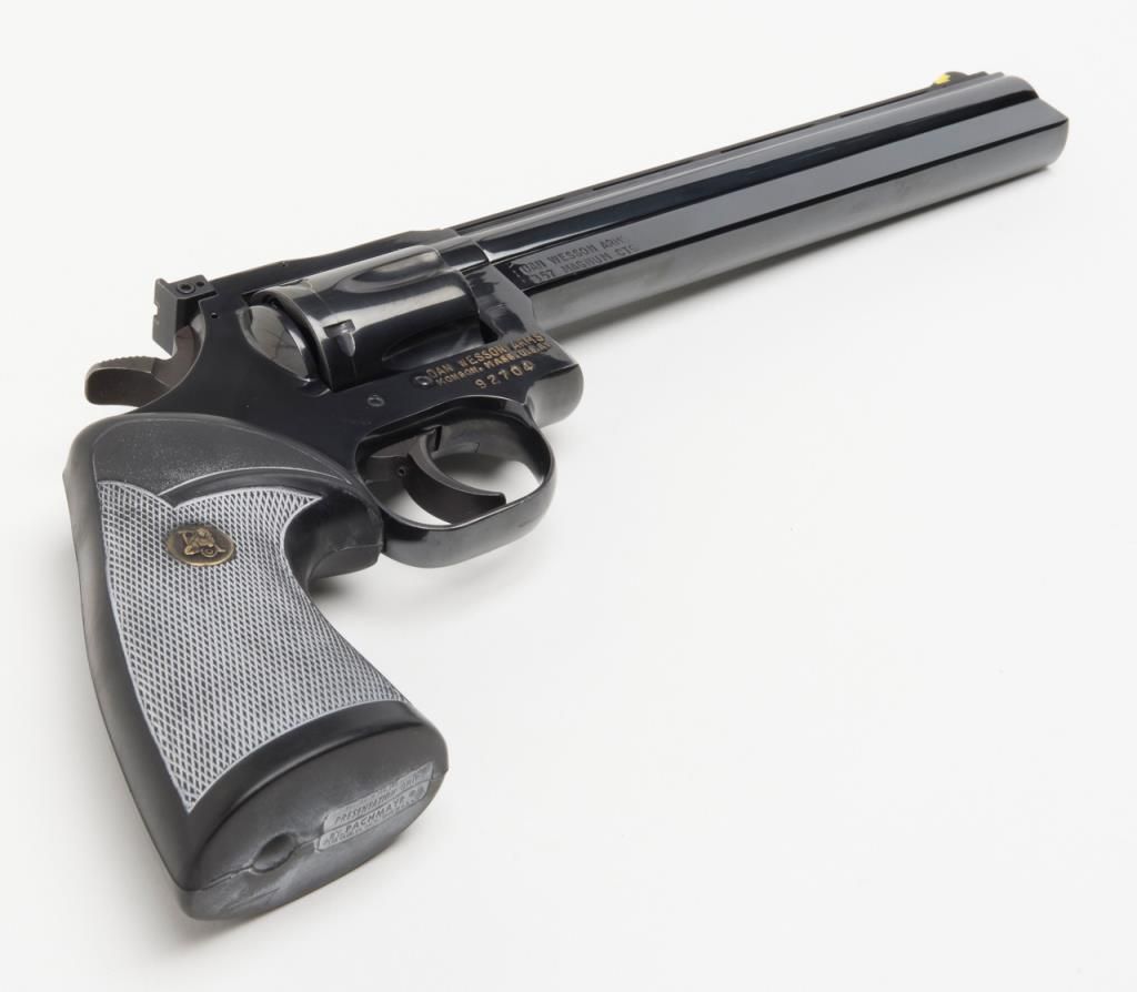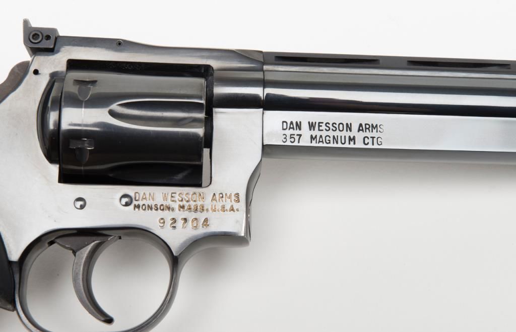 Dan Wesson DA revolver, .357 Magnum cal., 8” ventilated rib barrel, blue finish, Pachmayr combat checkered hard rubber grips, #92704 in overall fine condition showing a very good to fine bore, crisp action, sharp markings, very goodgrips; accompanied by an extra 6” ventilated rib barrel in factory cardboard box in fine condition with fine bore, instructions manual and tools. (Modern/PPT). Est.: $300-$600.