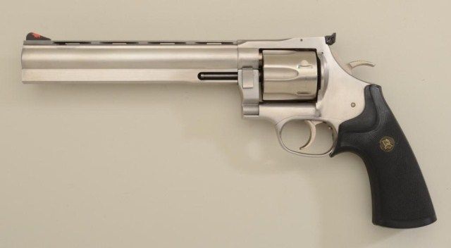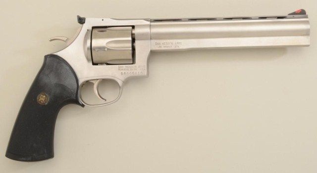 Dan Wesson DA revolver, .44 Magnum cal., 8” heavy ventilated rib and shrouded barrel, stainless steel, checkered hard rubber combat Pachmayr grips, #SB005410 in hardcase with extra barrel, wrench, tool and instructionmanual. This gun is in overall fine condition with a fine bore, crisp action and red insert front sight. Est.: $500-$750.