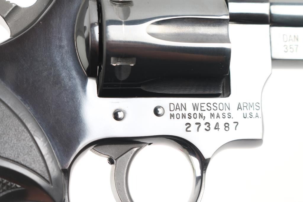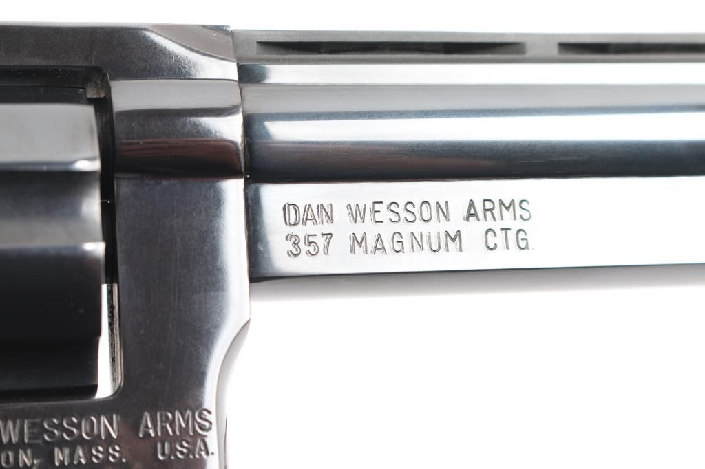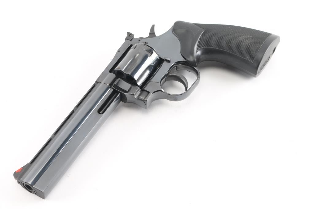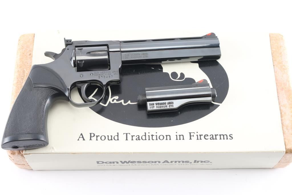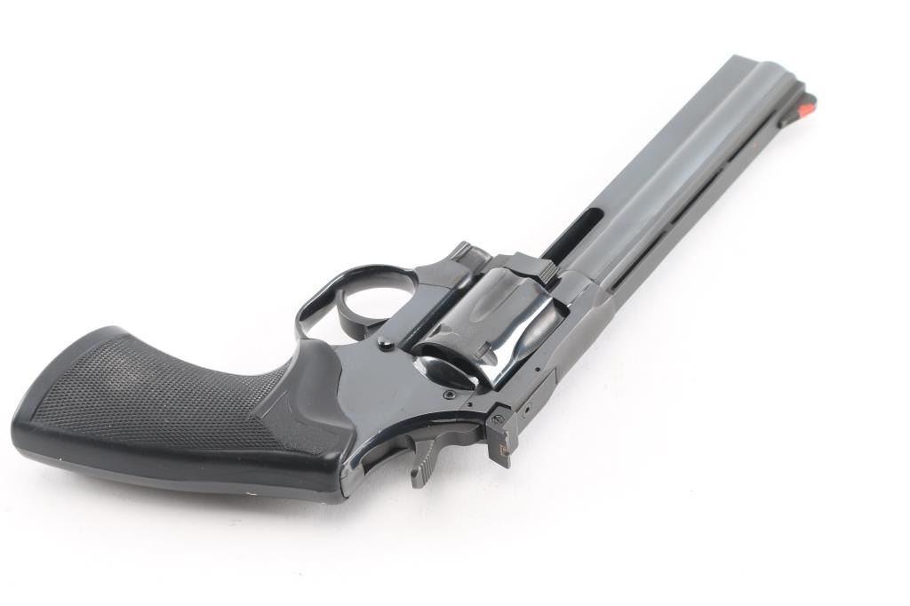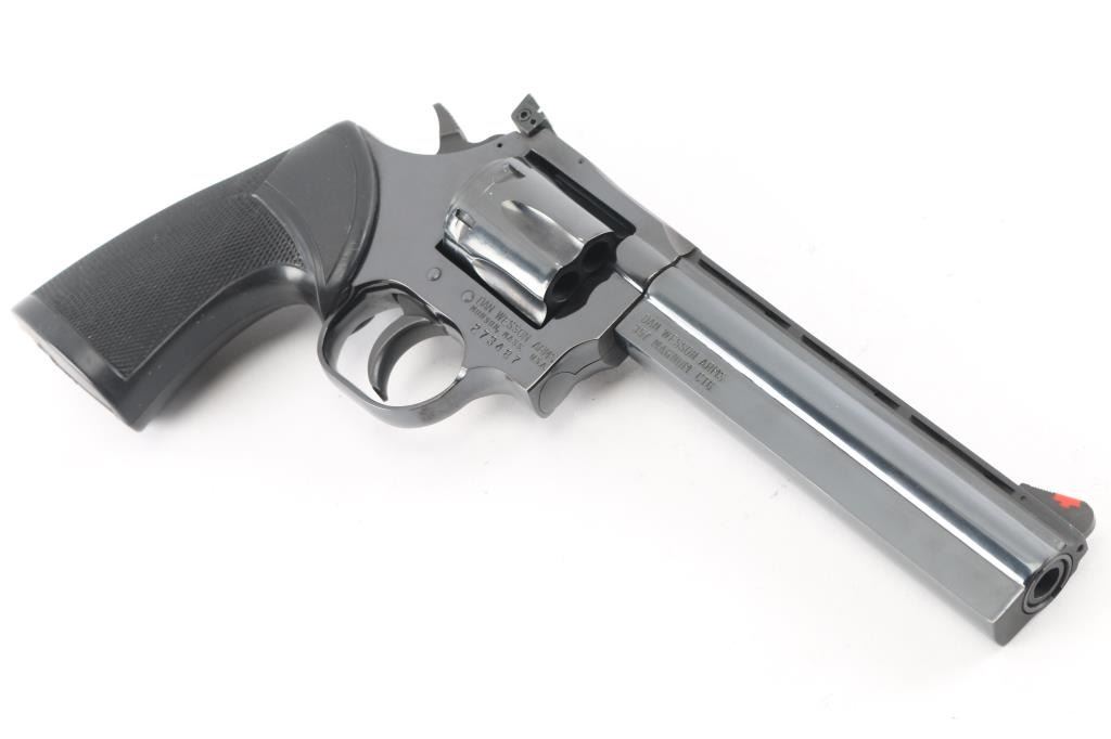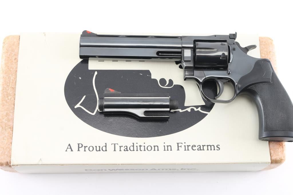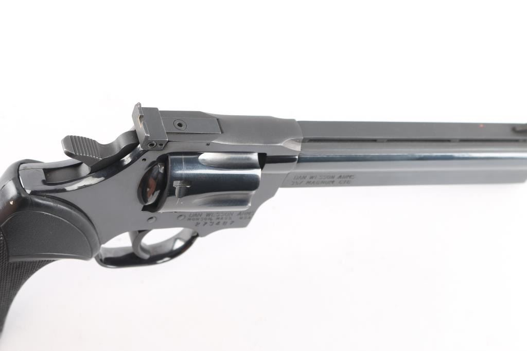 'Two Barrel Set' double action revolver designed for easy barrel changes, made in Monson MA. Set includes 4" solid rib and 6" vent rib (installed). Features blued finish, adjustable sights, six shot fluted cylinder, smooth trigger, knurled hammer spur, checkered black rubber grip. Bores on all barrels are very good, bright. Charge holes are smooth. Retains 98% finish, 95% on the 4" barrel shroud, with handling marks. Includes factory styrofoam box with cardboard sleeve, barrel tool. Box indicates that the 4" barrel was a later addition.