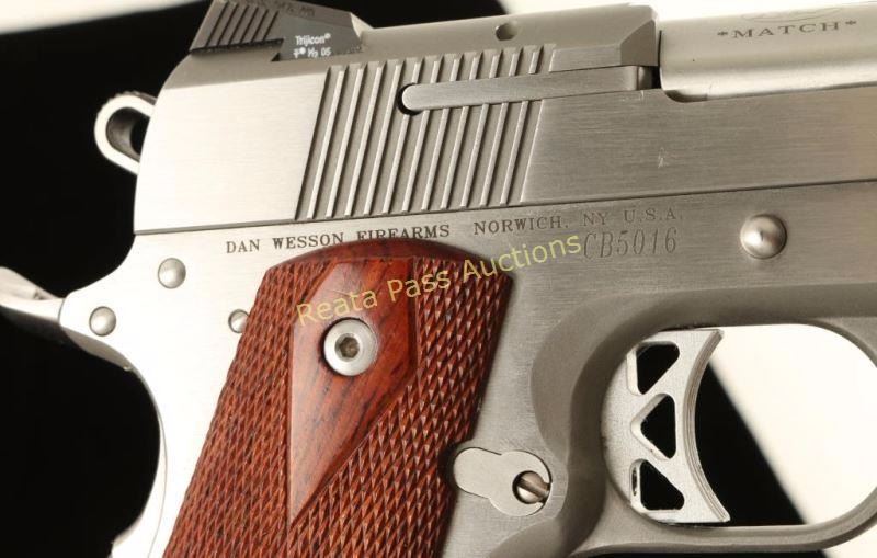 Premium stainless steel 1911-A1 style semi-automatic pistol chambered in .45 Auto. Features a brushed/matte finish, 4.25" match grade barrel, Trijicon three-dot night sights, serrated 'K" trigger, skeletonized hammer, thumb safety, beavertail grip safety, steel frame with bobbed backstrap, smooth mainspring housing, push button magazine release, 8 round Wilson Combat magazine, and double diamond checkered two-piece rosewood grips. Pistol exhibits light use with scuffs/holster wear on the matte finished top-portion of the slide and some minor handling marks on the slide flats. The magazine doesn't seat properly and will not engage the slide stop or lock into place. Action is strong, bore is very good and wood grips are near fine. Condition is very good++. ***Modern Firearm***