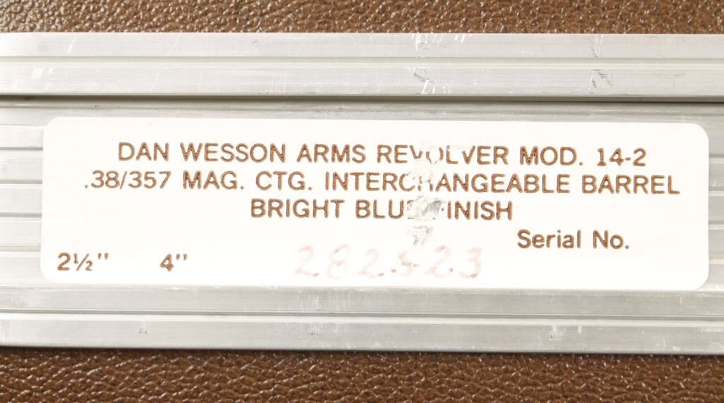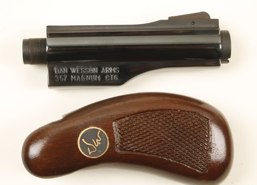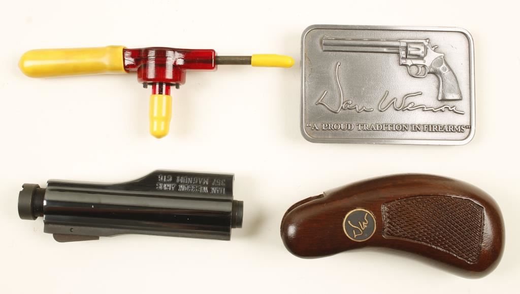 Plush case includes a .38/.357 Mag 4" barrel, barrel tool with gauge, belt buckle and medallion wood grips.