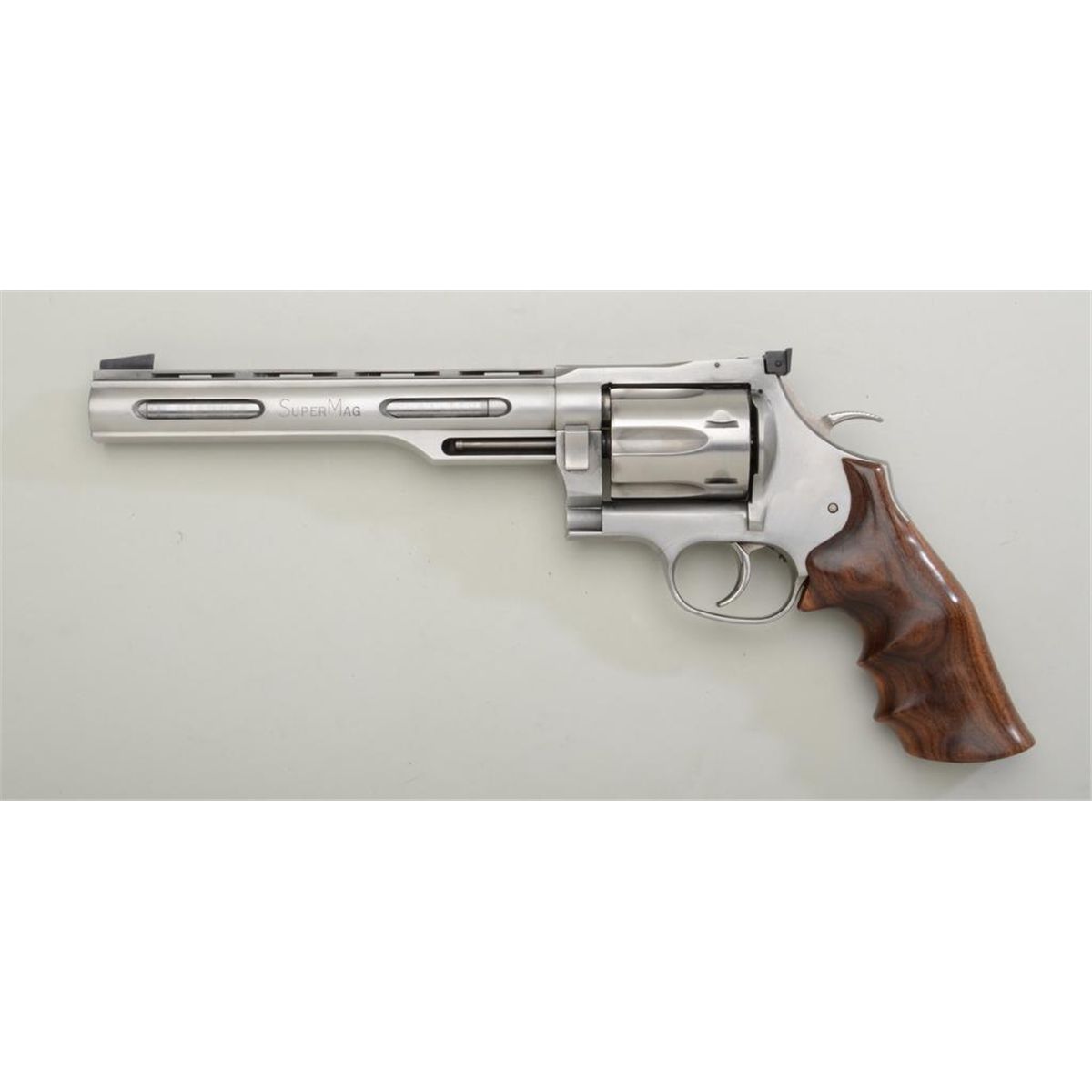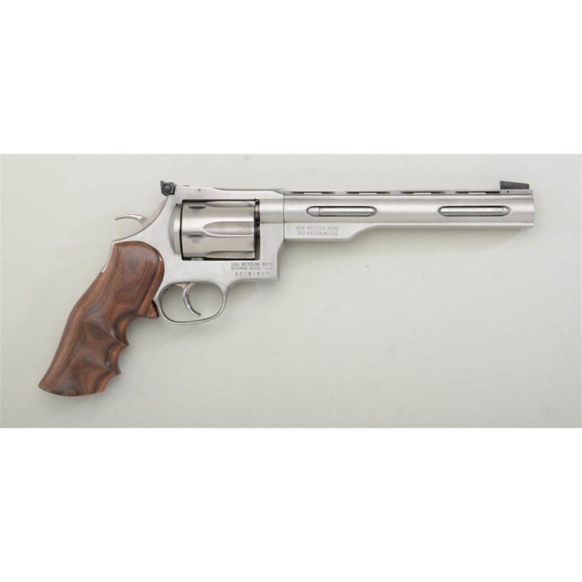 Dan Wesson Super Mag Model DA revolver, .357 Magnum cal., 8” ventilated rib barrel, stainless steel construction, custom finger groove hardwood grips, #SE001857. This hand cannon is in overall excellent conditionshowing a fine bore, crisp action, sharp markings and beautifully grained grips. Est.: $450-$650.