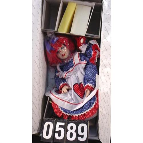 From the Danbury Mint, a porcelain homage to Raggedy Ann Doll. Created by doll artist Kelly RuBert in 1996. Comes with genuine Raggedy Add dolly. This porcelain doll is in mint condition. Doll is 18 inches in length and box measures 26" x 11" x 7.5" and weighs 8 lbs 4 oz. [81]